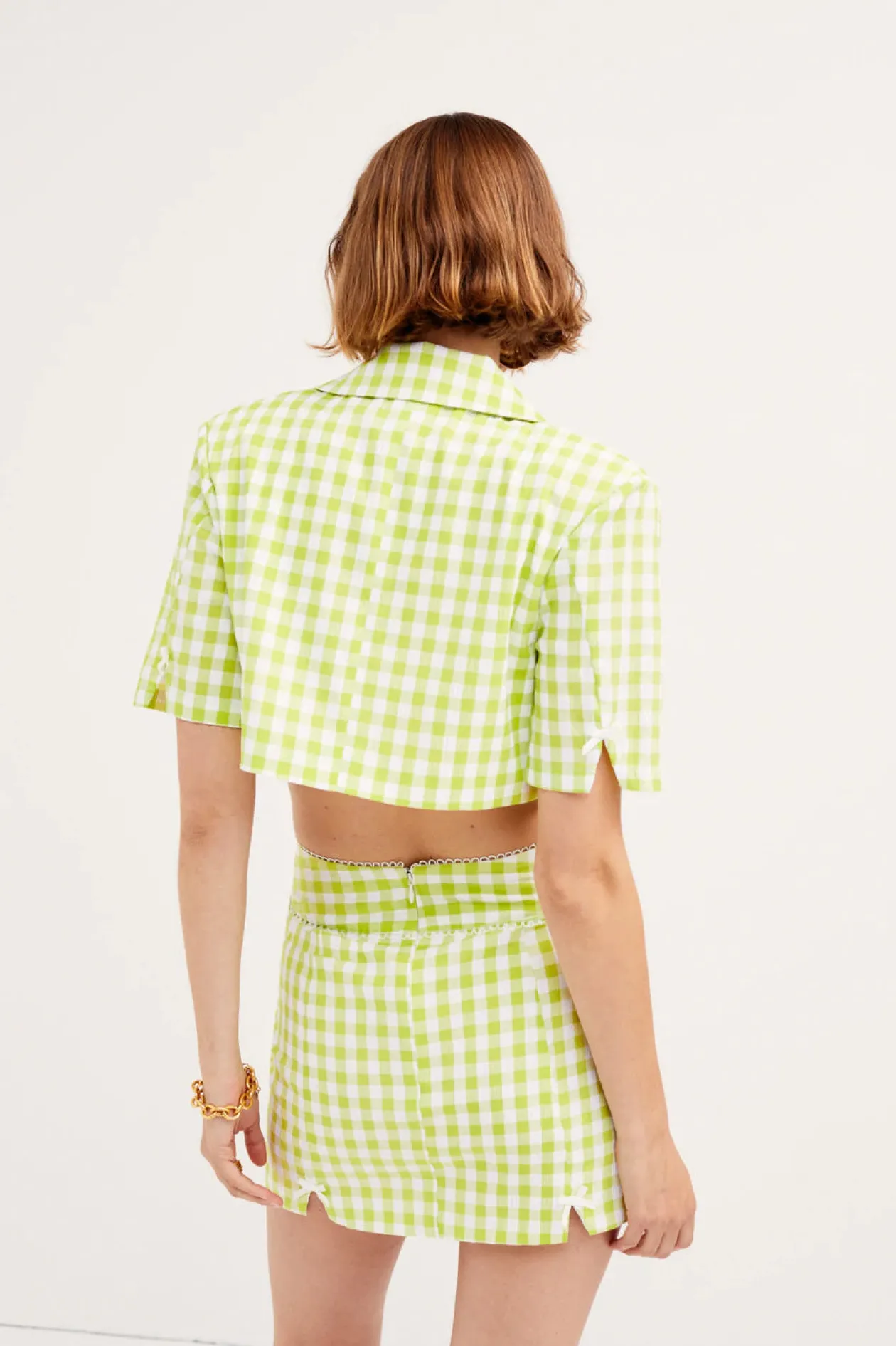 Summery textured gingham mini skirt featuring princess seam slits with delicate satin bows.