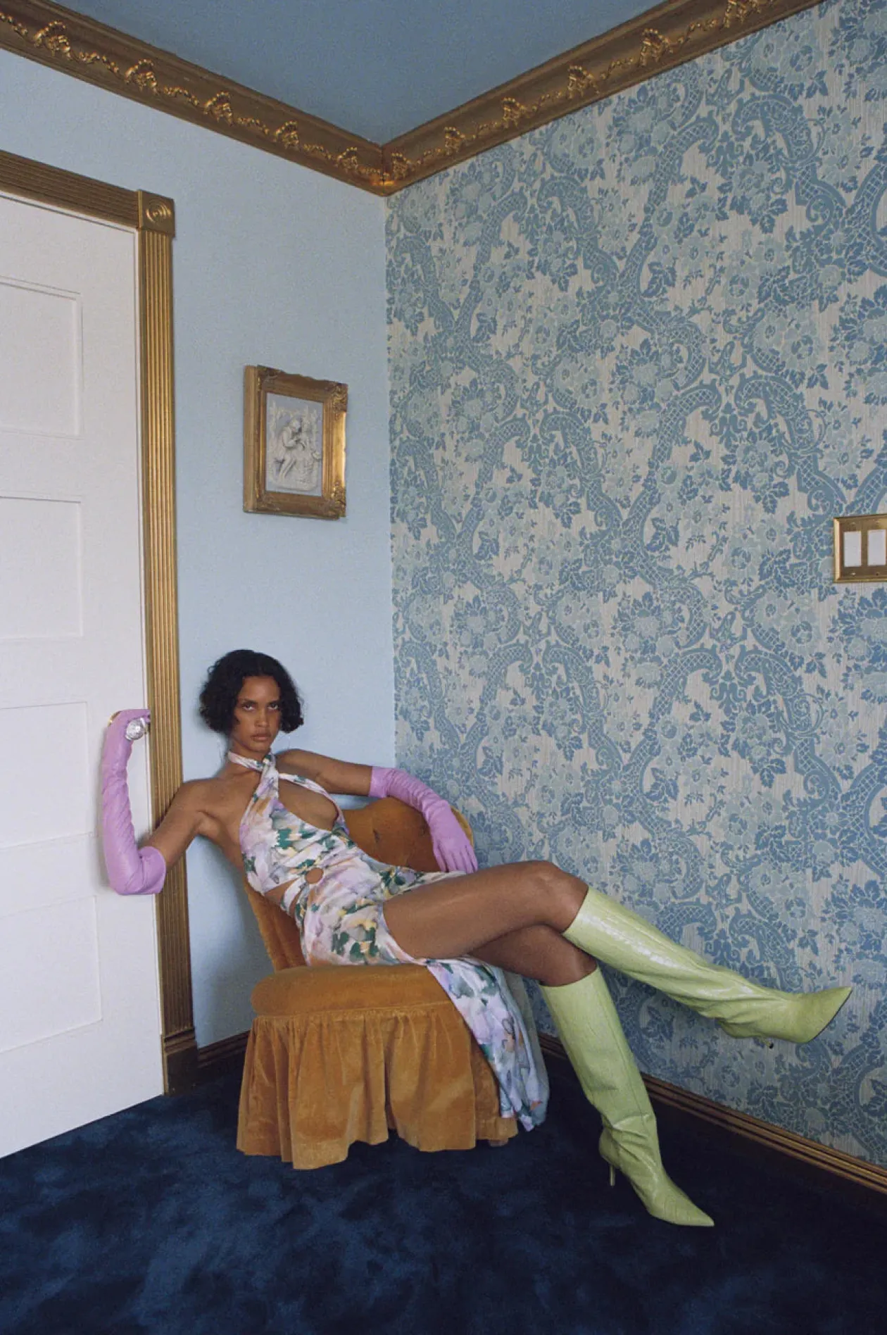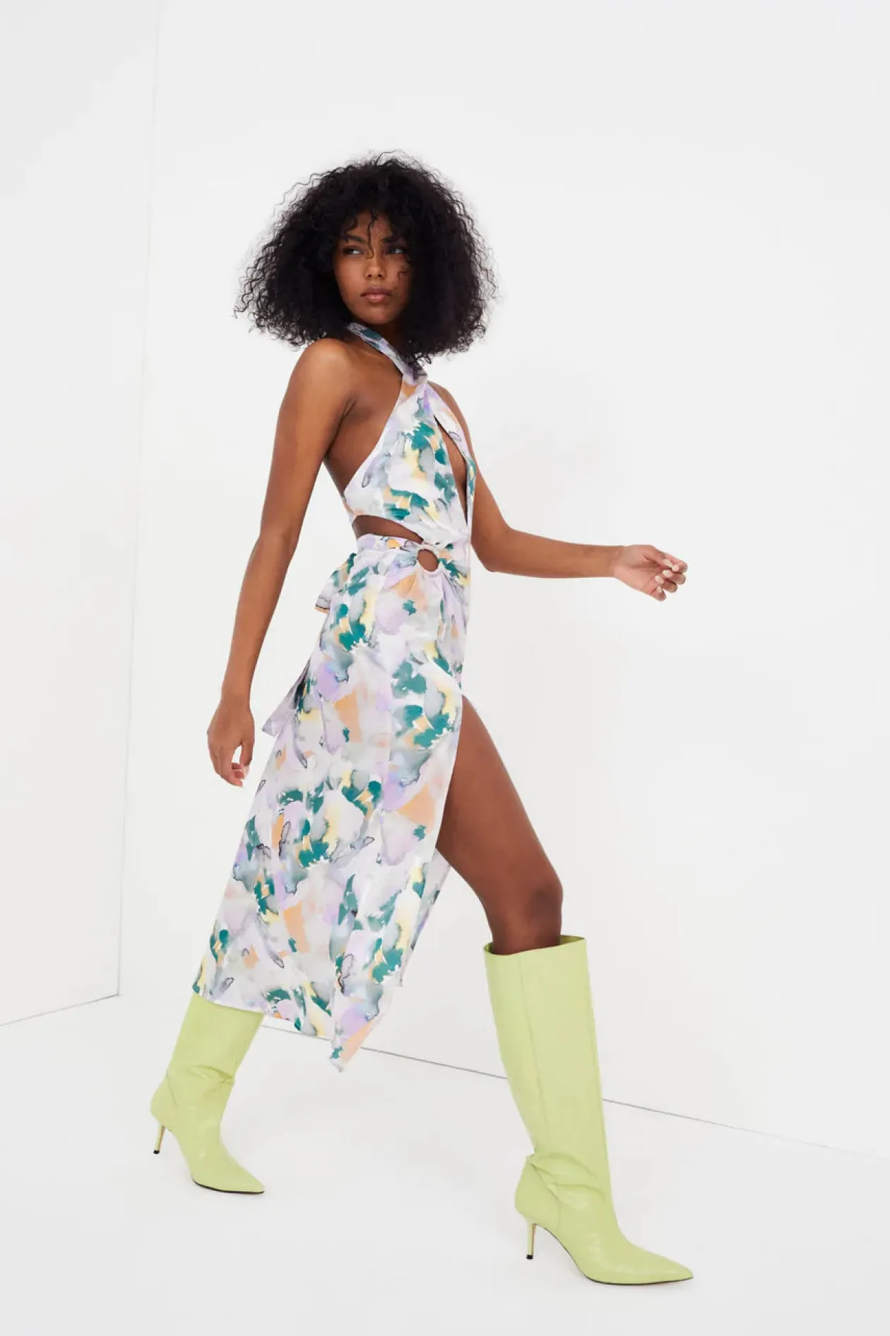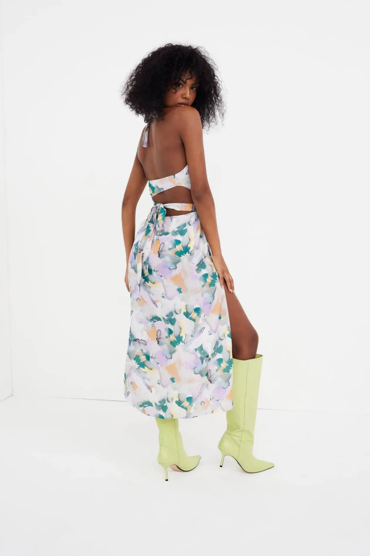 Smokey floral halter midi dress with asymmetrical cut out at waist and thigh-high slit.
