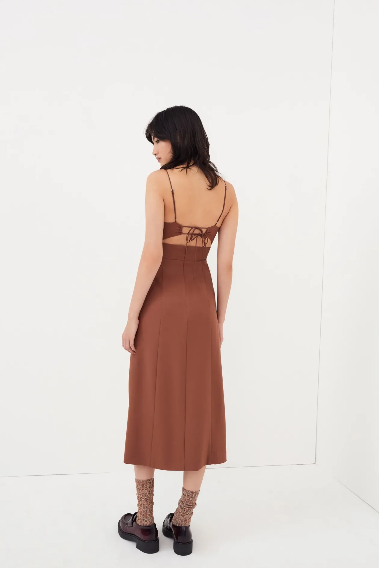 Gaberdine midi dress with open neckline, cut-out at waist, and wide self-belt with metal hardware.