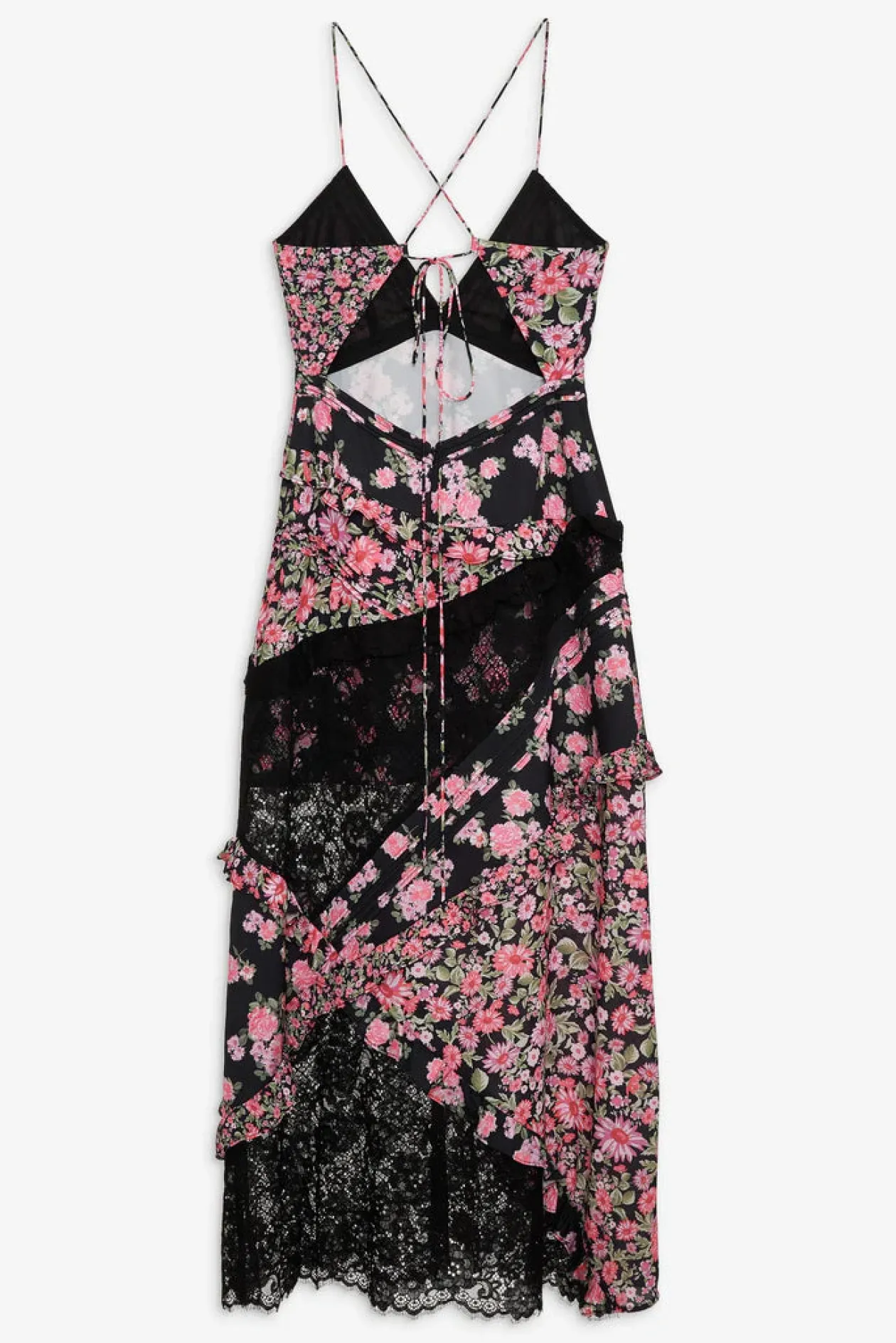 Our bestselling maxi dress silhouette is back in black and pink floral print. Inspired by ’70s dresses, the Rosalyn patchwork dress has a plunging neckline and features mixed print paneling and floral lace with ruffle details throughout.