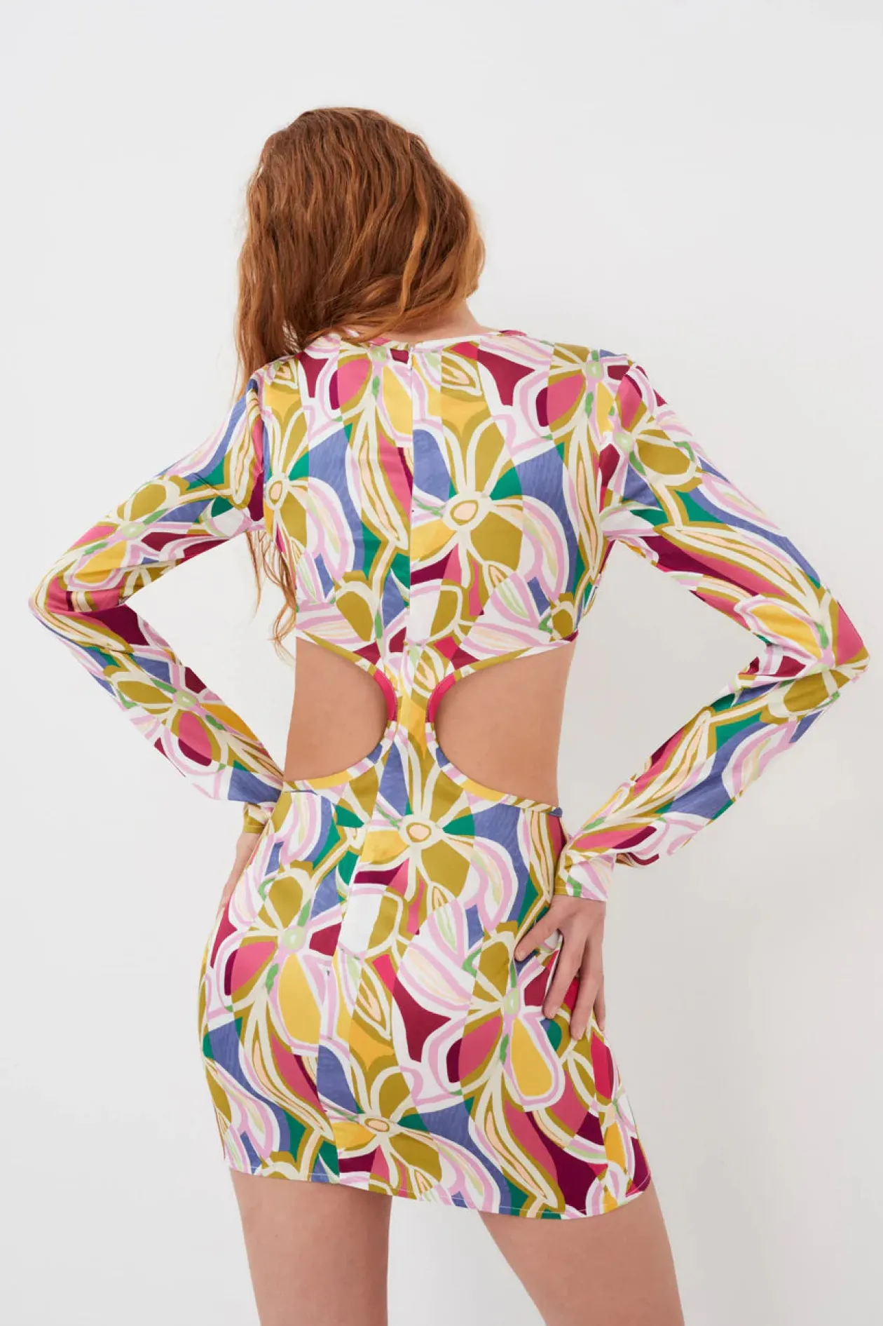 Quilted daisy body-con mini dress with deep keyhole at neckline and cut-outs clear daisy ring trim at waist.