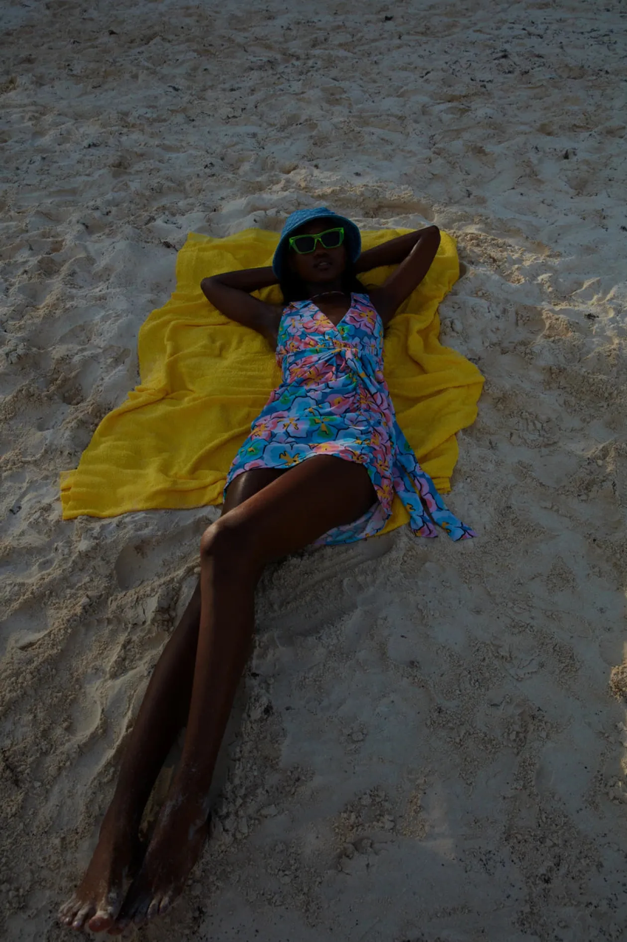 Monet-inspired floral print mini dress featuring a plunging neckline and a tied gathered skirt.