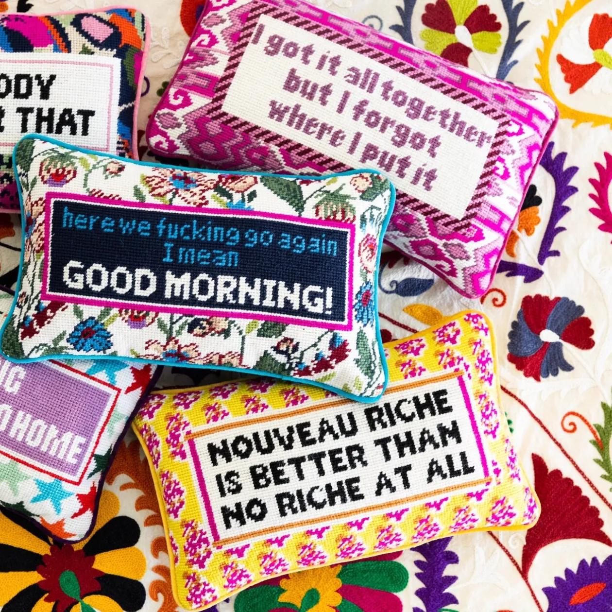 Who can relate?!?! This pillow perfectly captures the sentiment we all must feel a zillion times a day. Make a statement with this charming-meets-chic needlepoint pillow. Hand embroidered in wool and backed in luxe plum velvet, we’ve revived this Southern staple with sayings that are sure to get a smile.