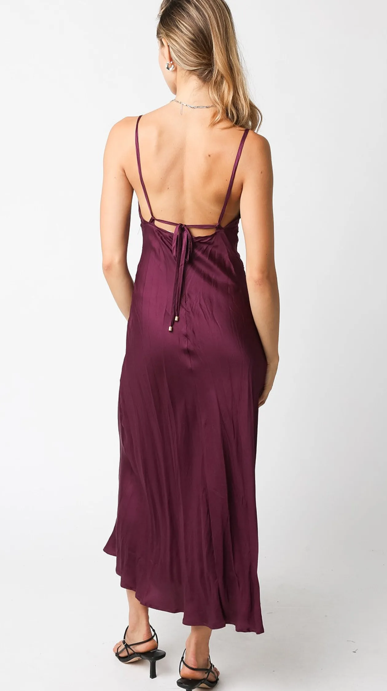 Plum colored silky midi dress with embroidered bust & adjustable tie straps.