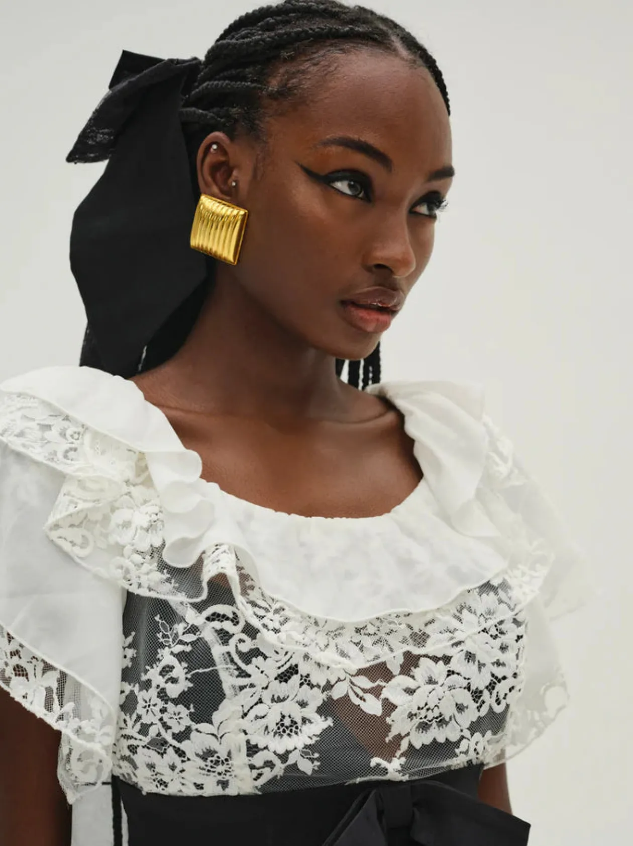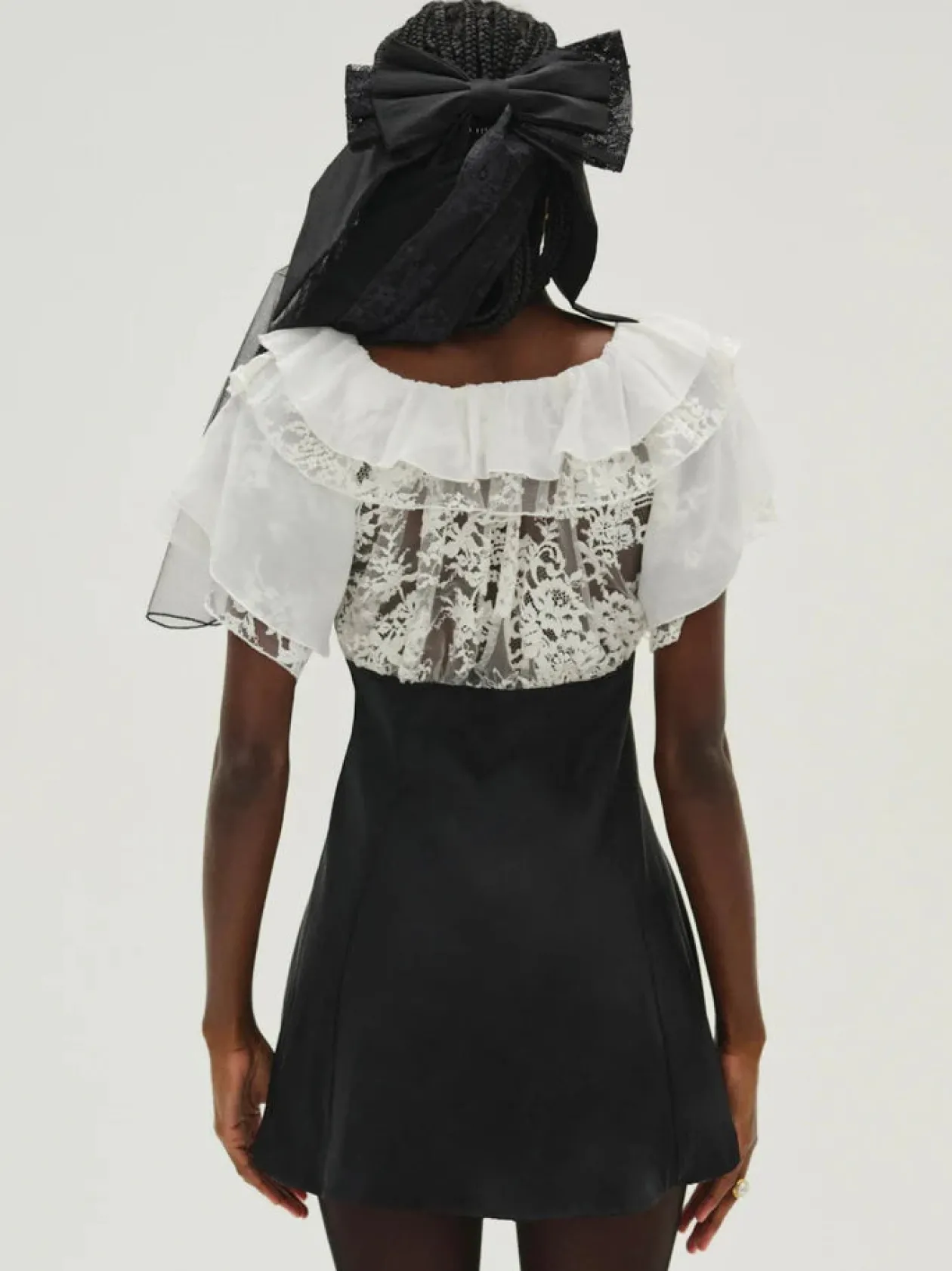 Indulge in the joy of the holidays with the Holiday black and white lace mini dress—a piece that transitions from dinner dress to party dress with stylish ease. Featuring a sheer lace bodice over taffeta cups and a full gathered skirt, this little black dress is decorated with tiered chiffon and lace ruffles and a fixed taffeta bow at the waist.