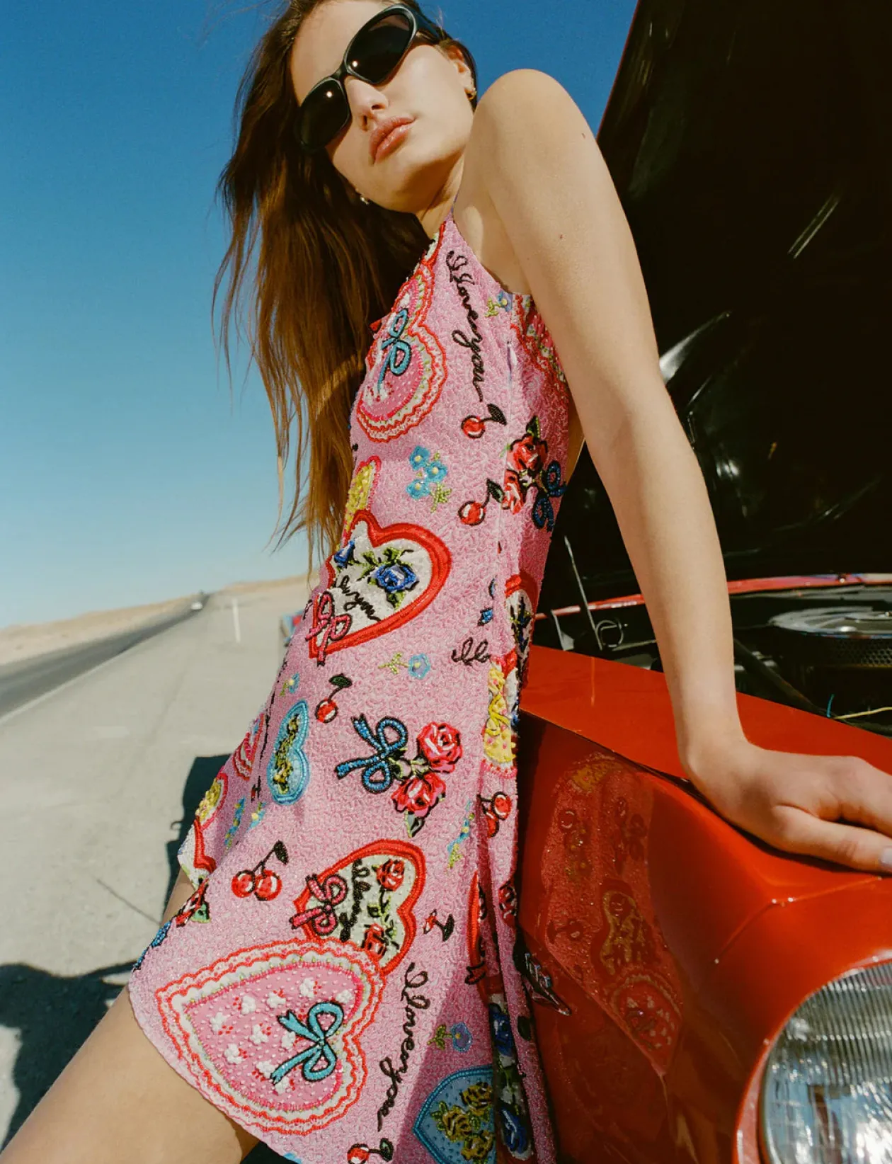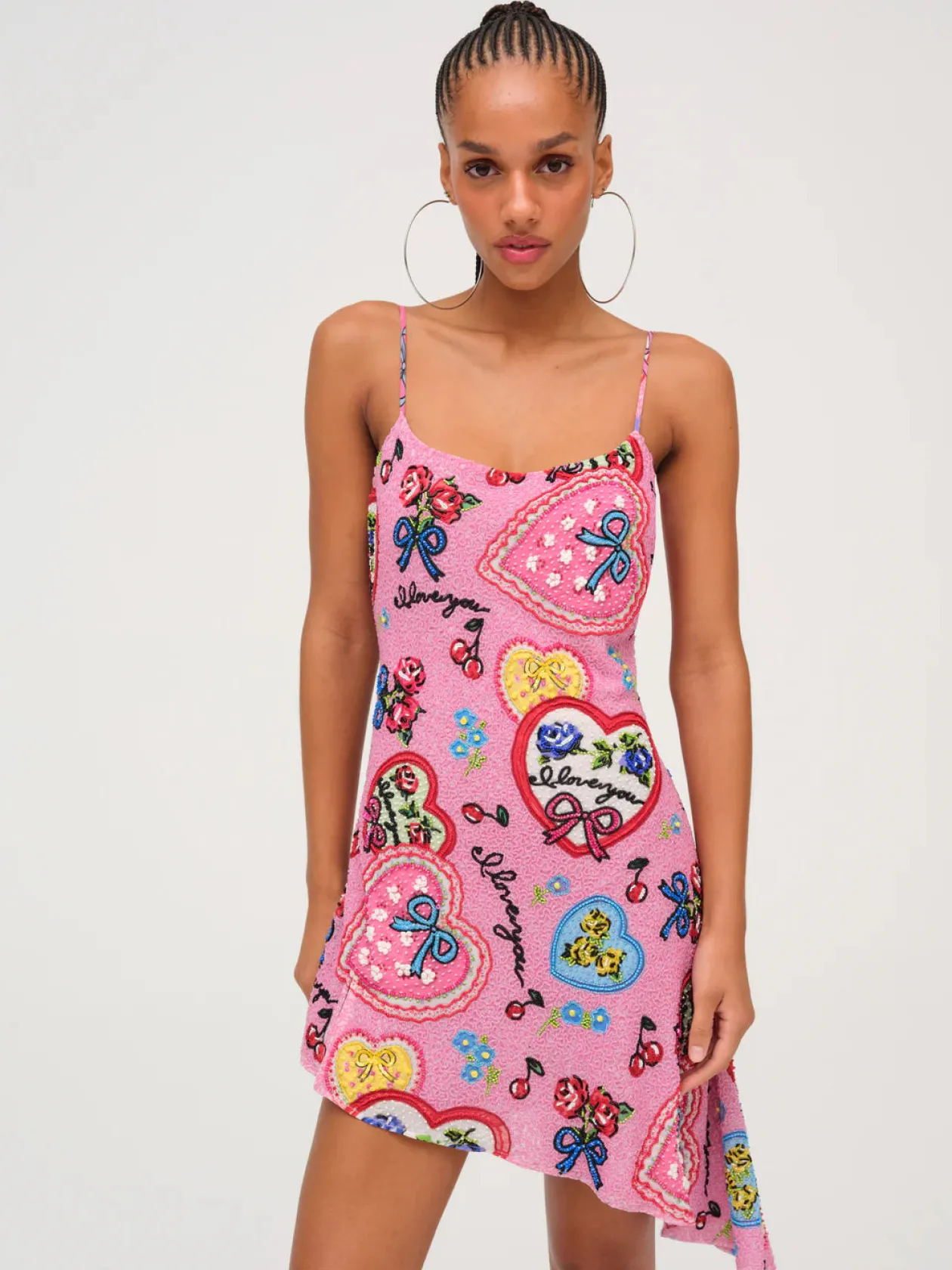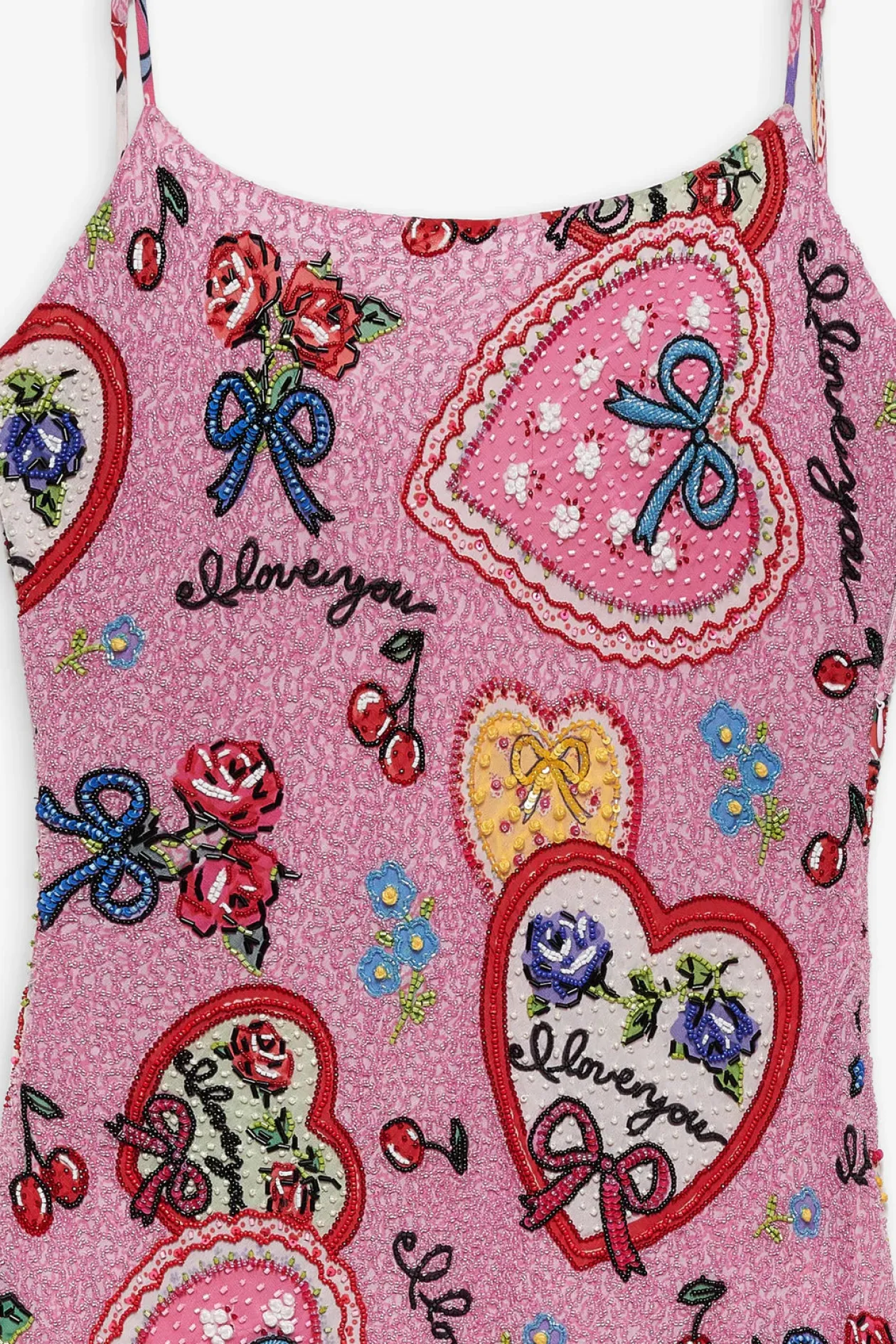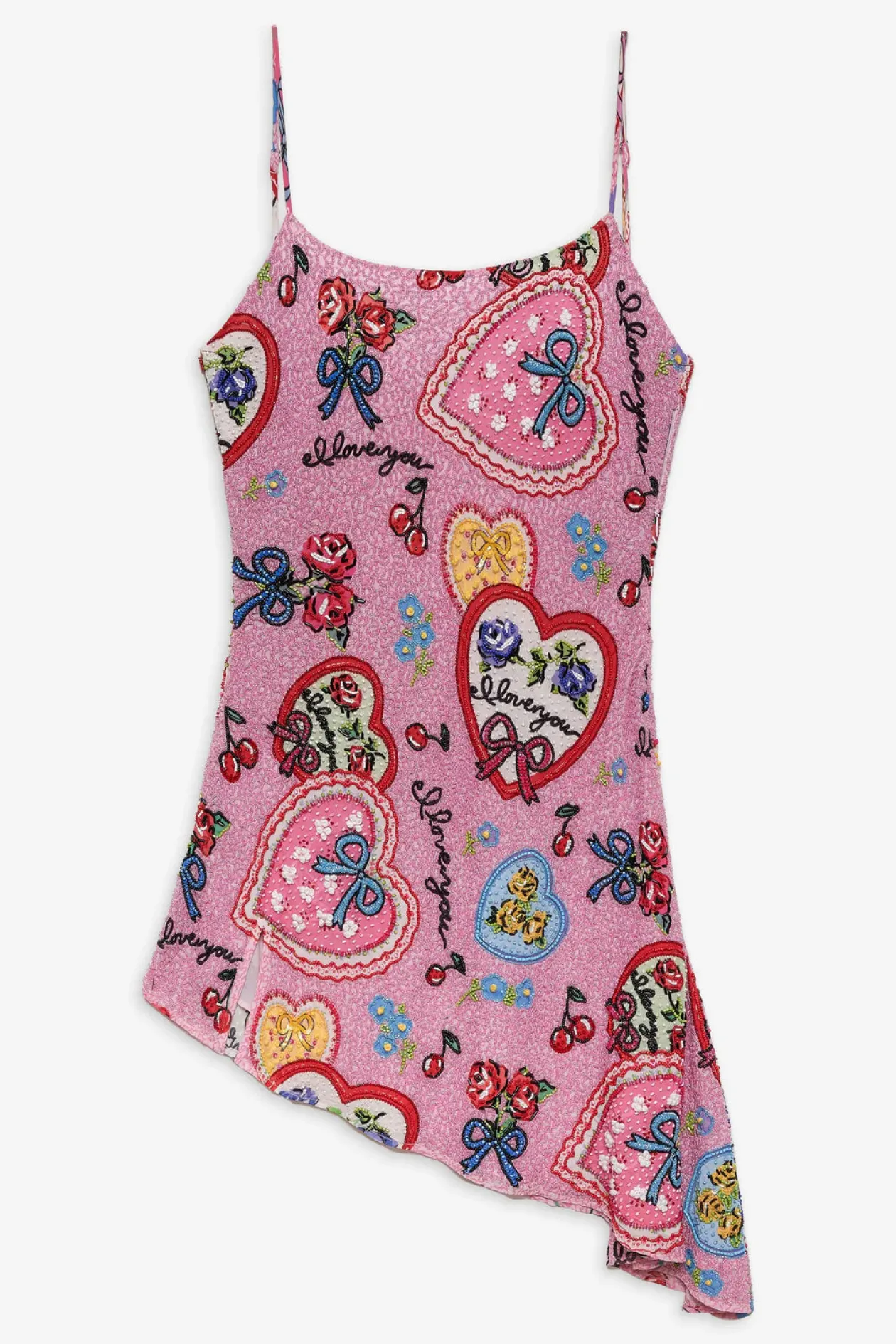 Like a postcard from a bygone era, the I Love You beaded mini dress is the perfect Valentine’s Day ensemble for any and all of your love-filled escapades. This pink mini dress is adorned with an allover intricate “I love you” heart handkerchief and cherry beaded embroidery, and finished with an alluring low open back and asymmetrical hem.