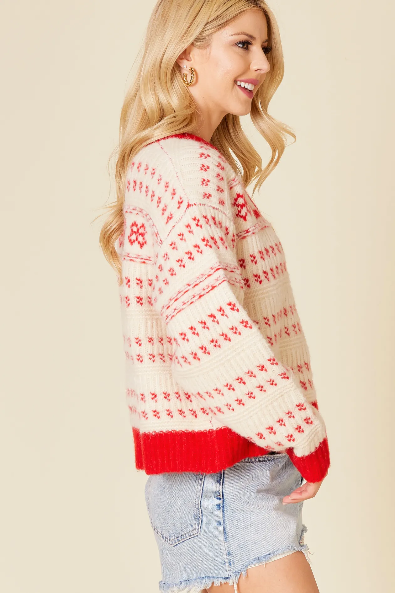 Love lettered sweater top featuring round neck, dropped shoulder, cuffed sleeves and cuffed hemline.
