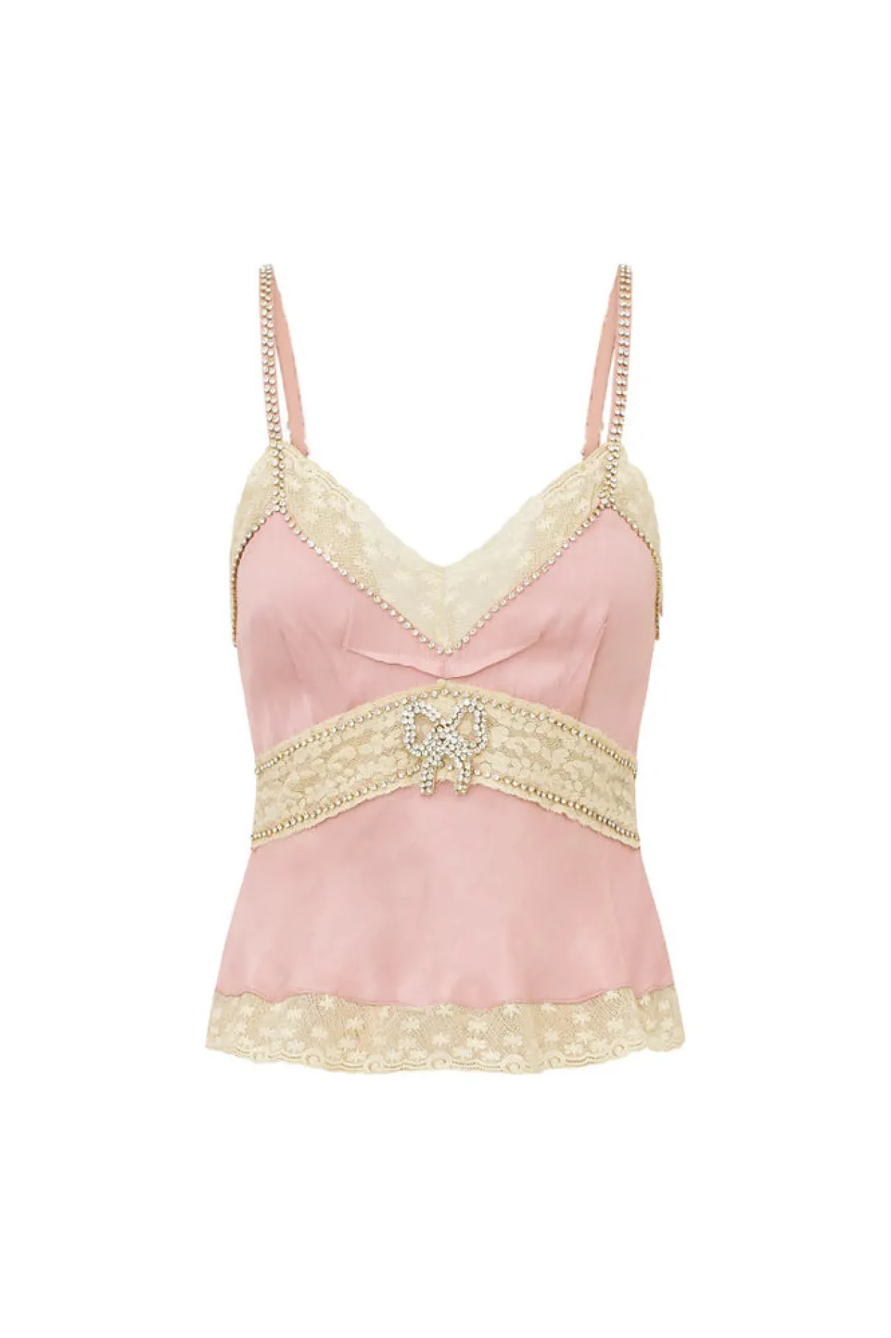 Loving on the Laticia Top. This extra flirty piece is crafted from a lightweight, silky satin fabric with vintage-inspired laces detailed throughout. The cami top features rhinestone-embellished, adjustable spaghetti straps that descend to a v-neckline sitting above an embellished crystal bow at the waist. This piece is finished with a zipper on the side for functionality.