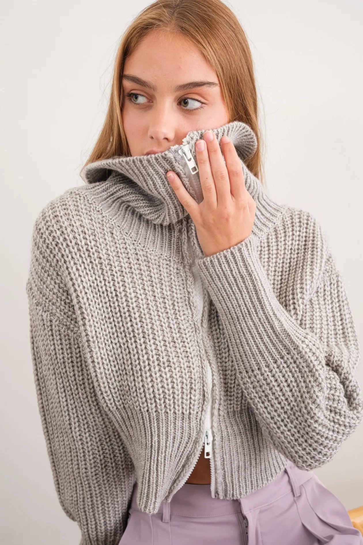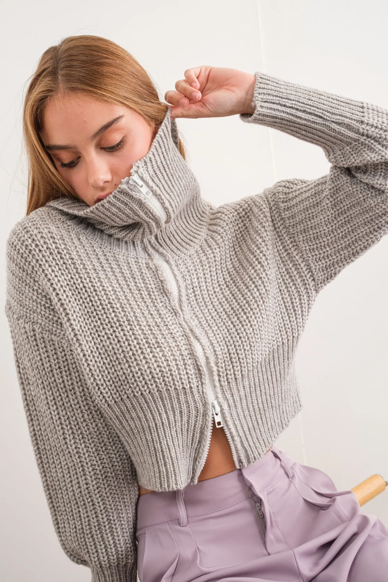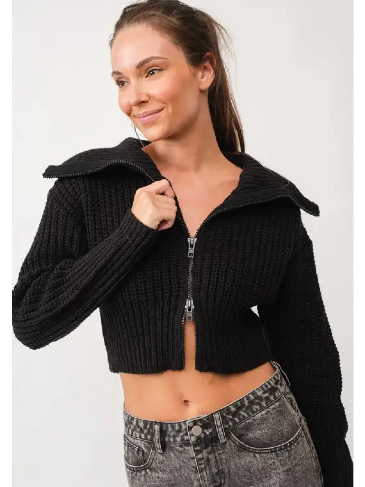 Leona Double Zip Up Neck Cropped Cardigan
