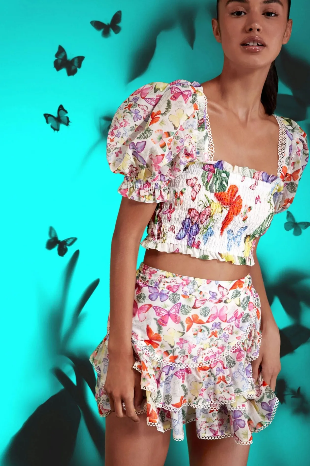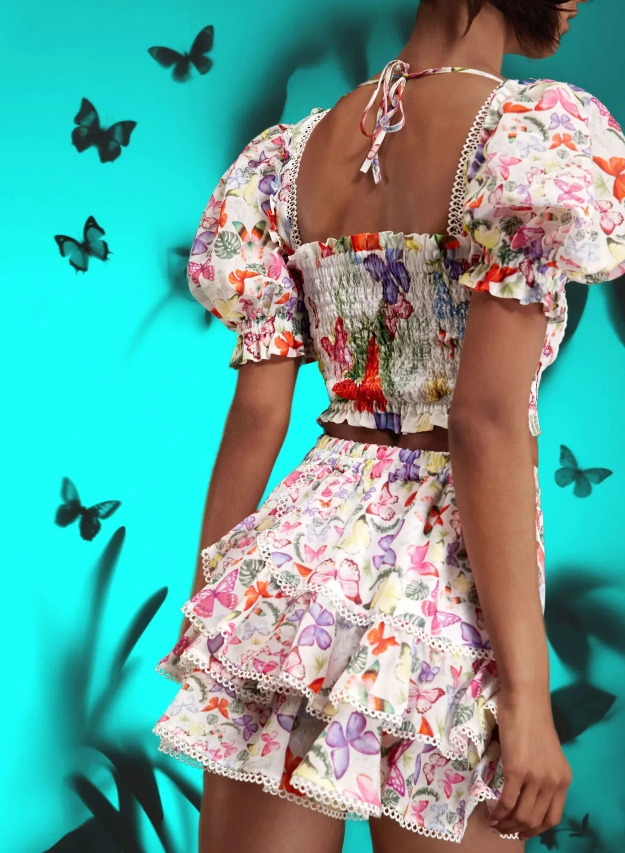 The Lirio top in White Borbo fits and flatters your figure thanks to its smocked body and square neckline adorned with geometric guipures. Its puffed sleeves complete the feminine silhouette of the piece printed with hand-painted spring motifs on cotton.