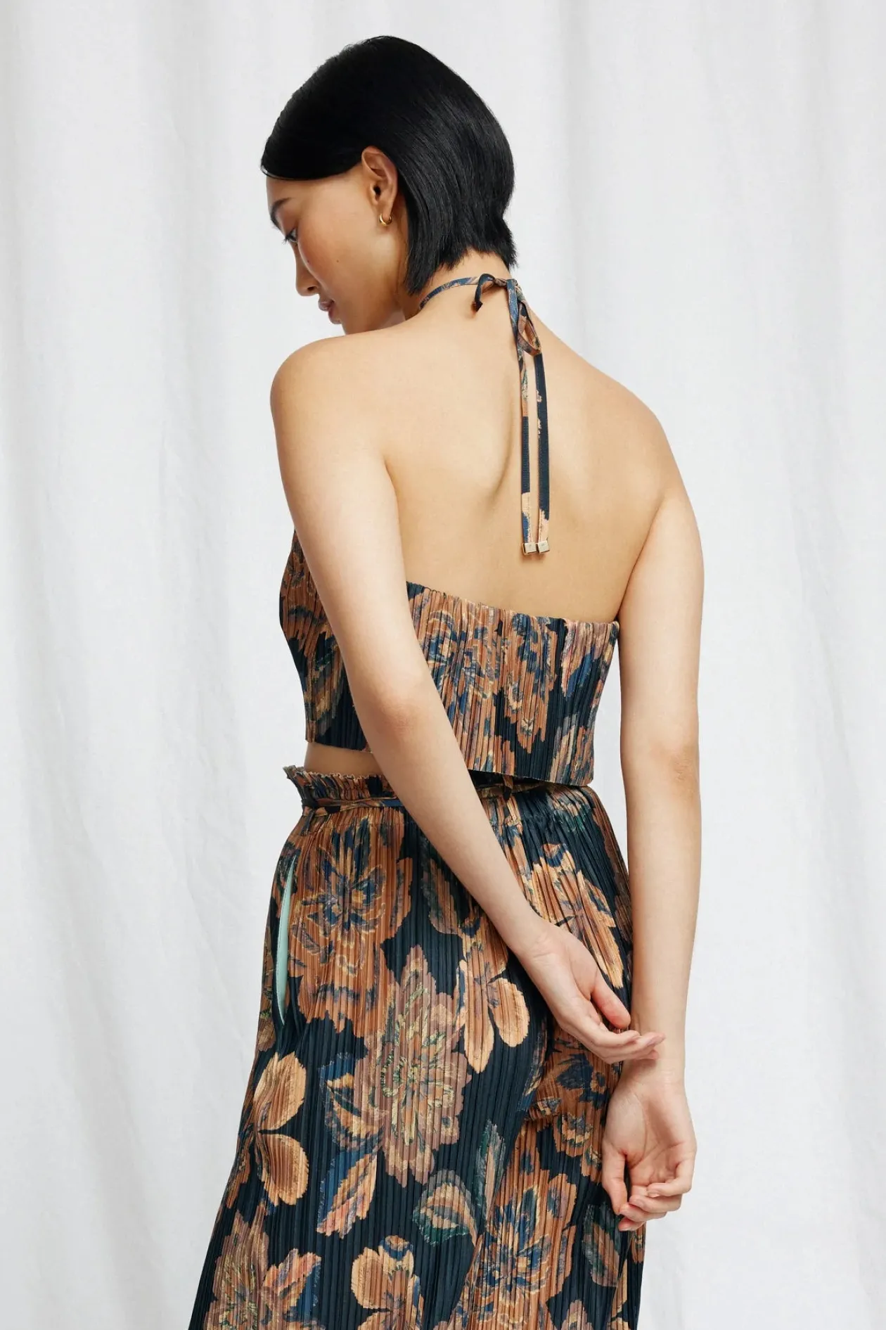 A dreamy piece, perfect to pack away on your next vacay. The Lori Top in Gold Tapestry is crafted from a soft touch plisse fabrication. Designed with ease of wear in mind, this piece is cropped, features a halter neckline, upper back bodice elastication and luxurious gold hardware. Pair with the Lori Pant for a complete look.