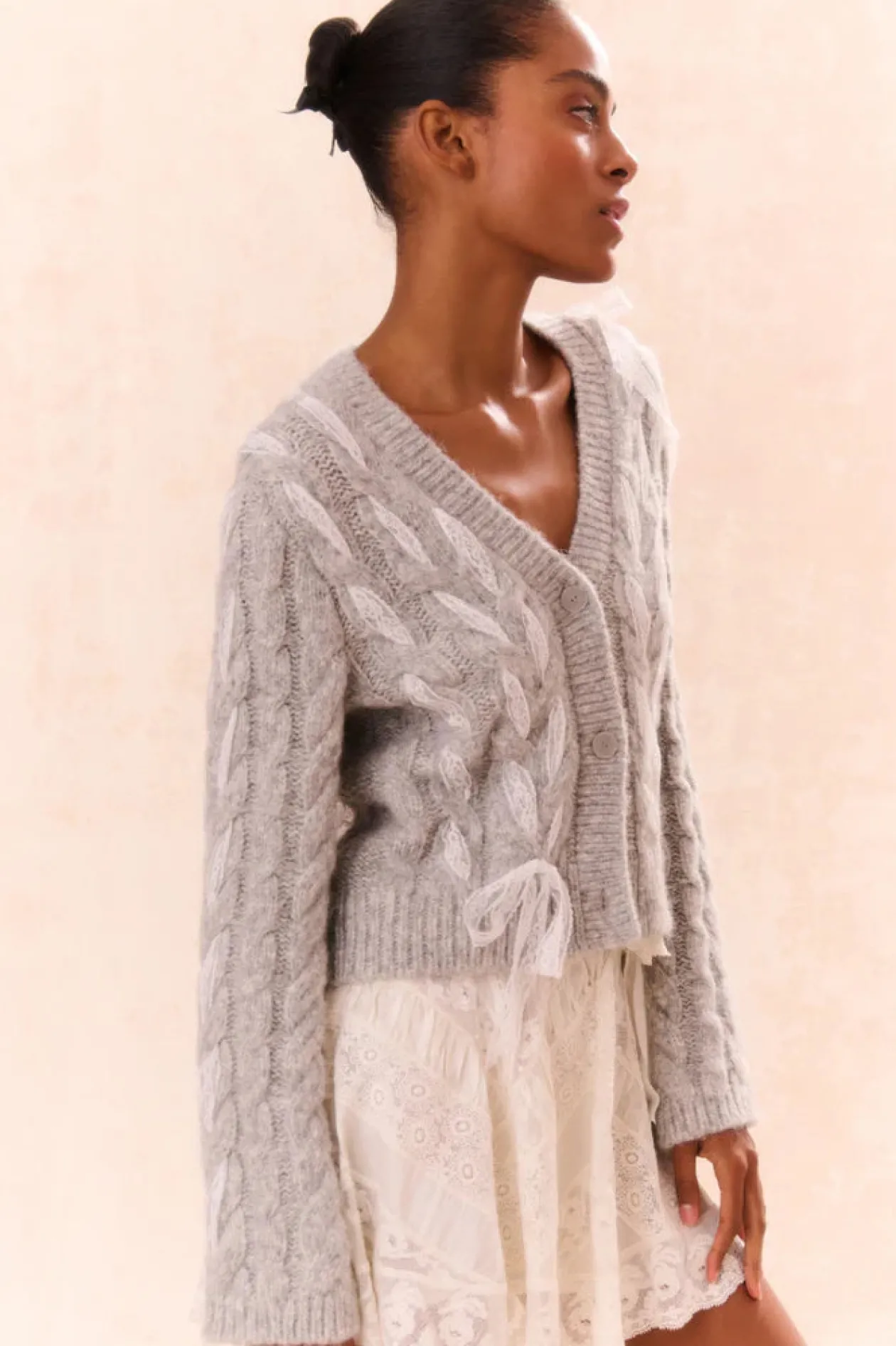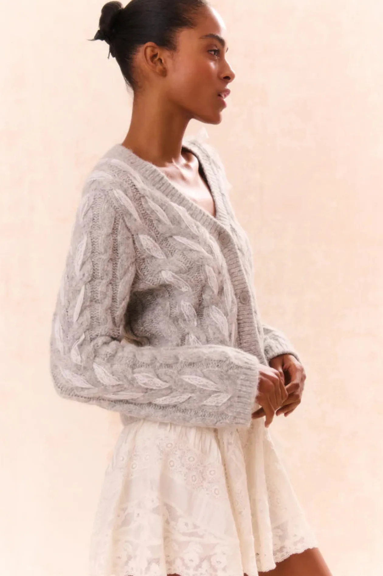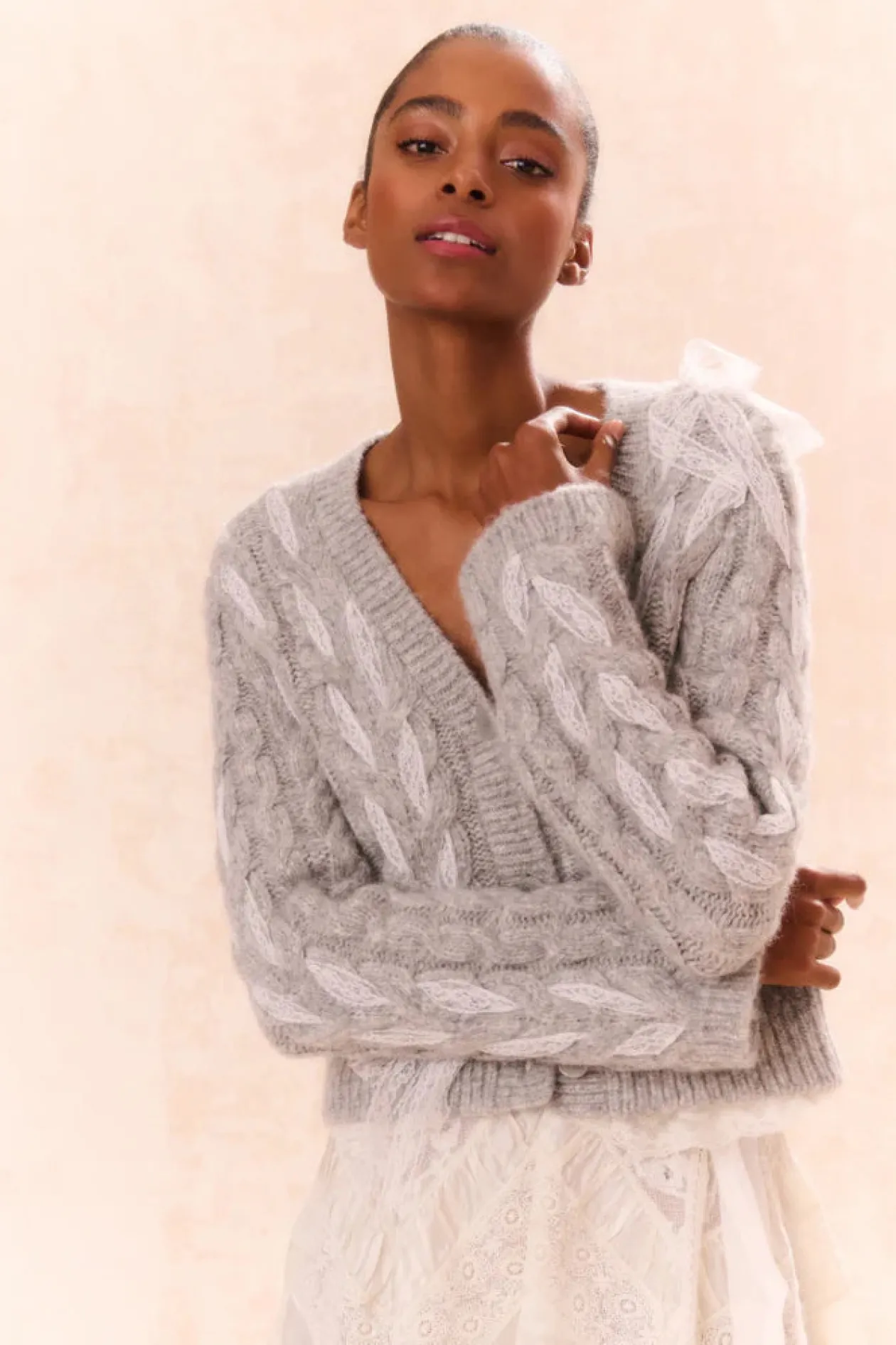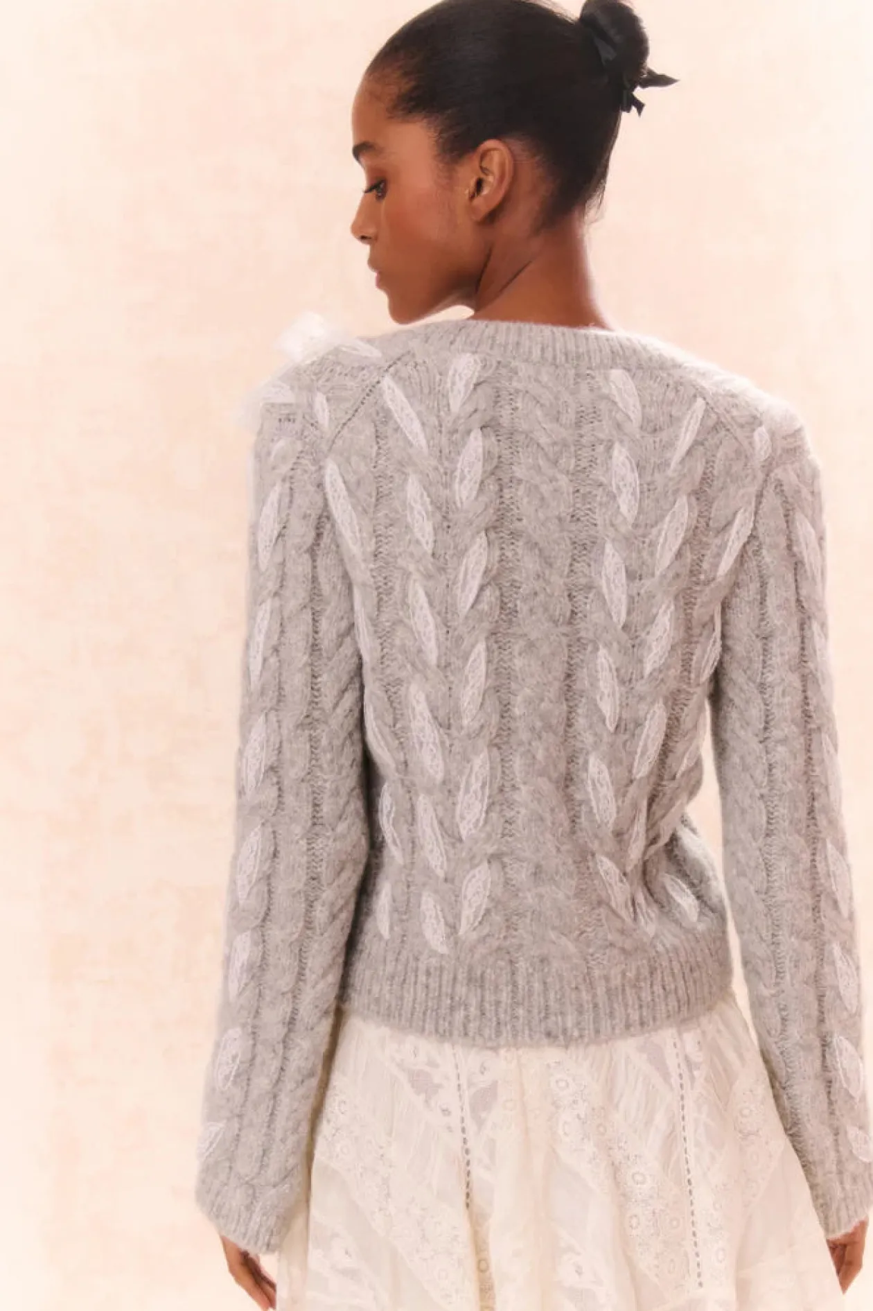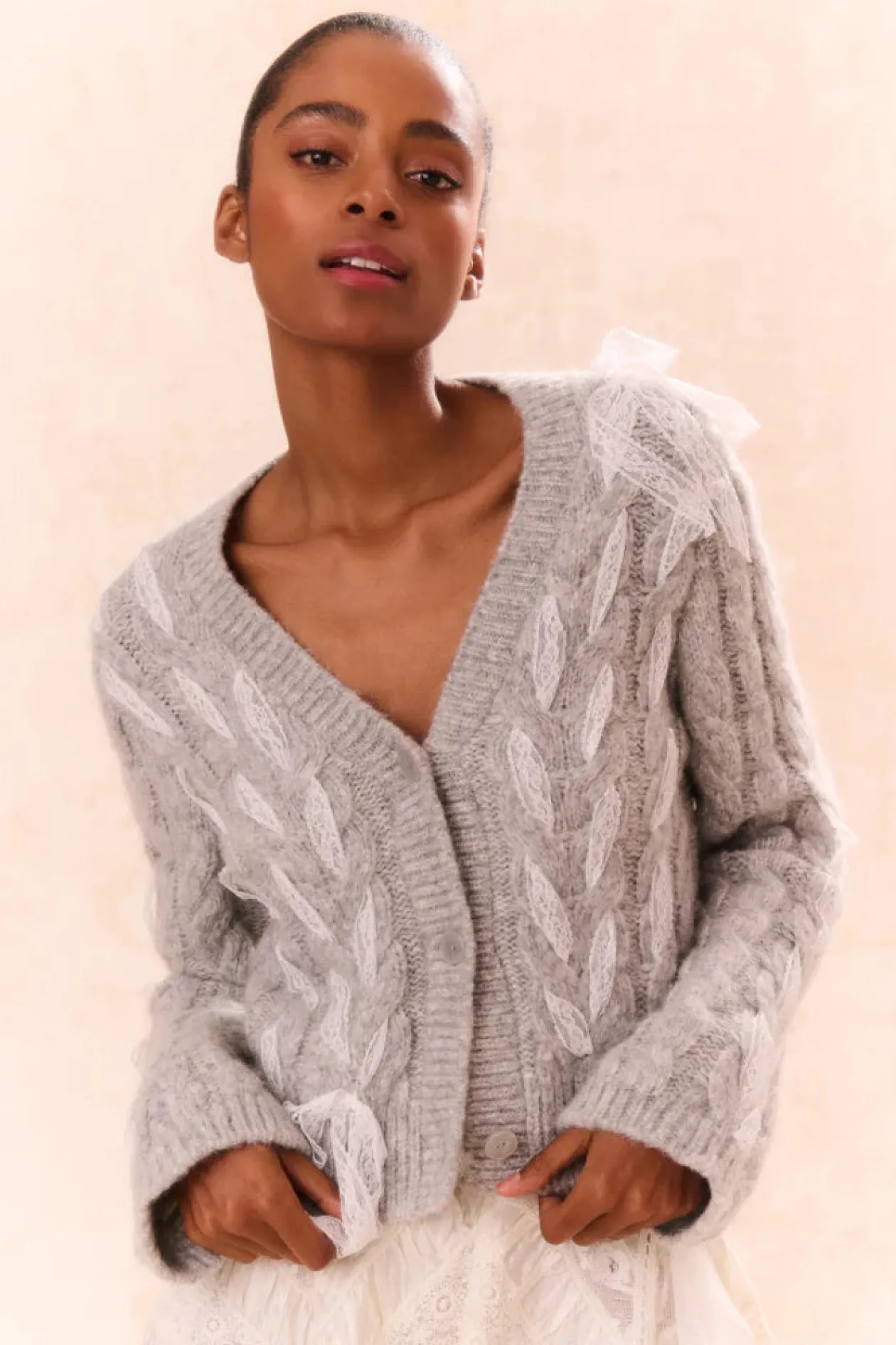 Loving on the Louella Cardigan. This cozy chic cardigan is designed from a soft alpaca blend wool. She features delicate lace ribbon cables woven throughout for a playful look. With a shorter body and straight sleeves, this knit stuns with a modern yet flattering fit. The piece is complete with our custom LoveShackFancy faux shell buttons down center front.