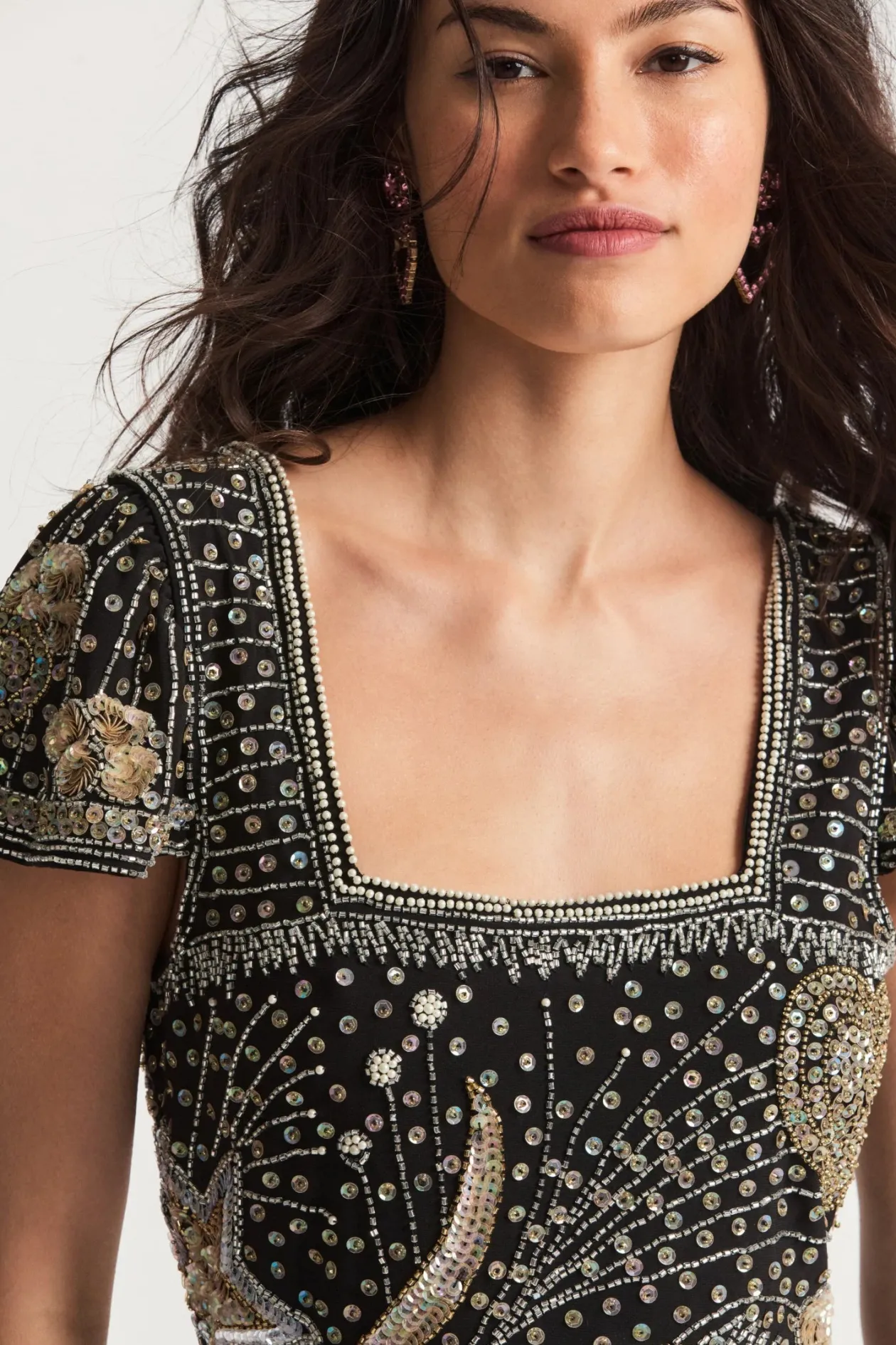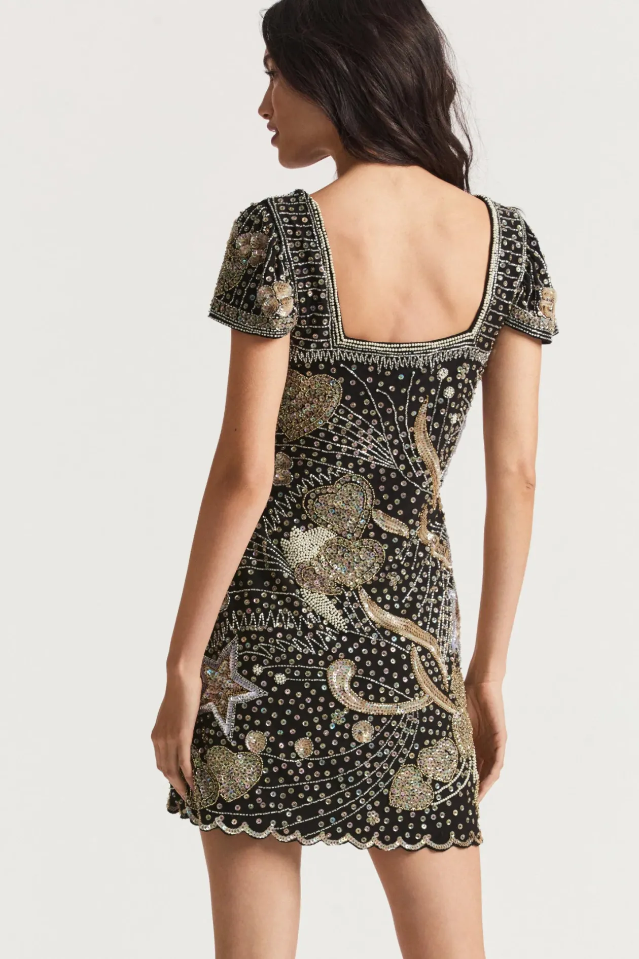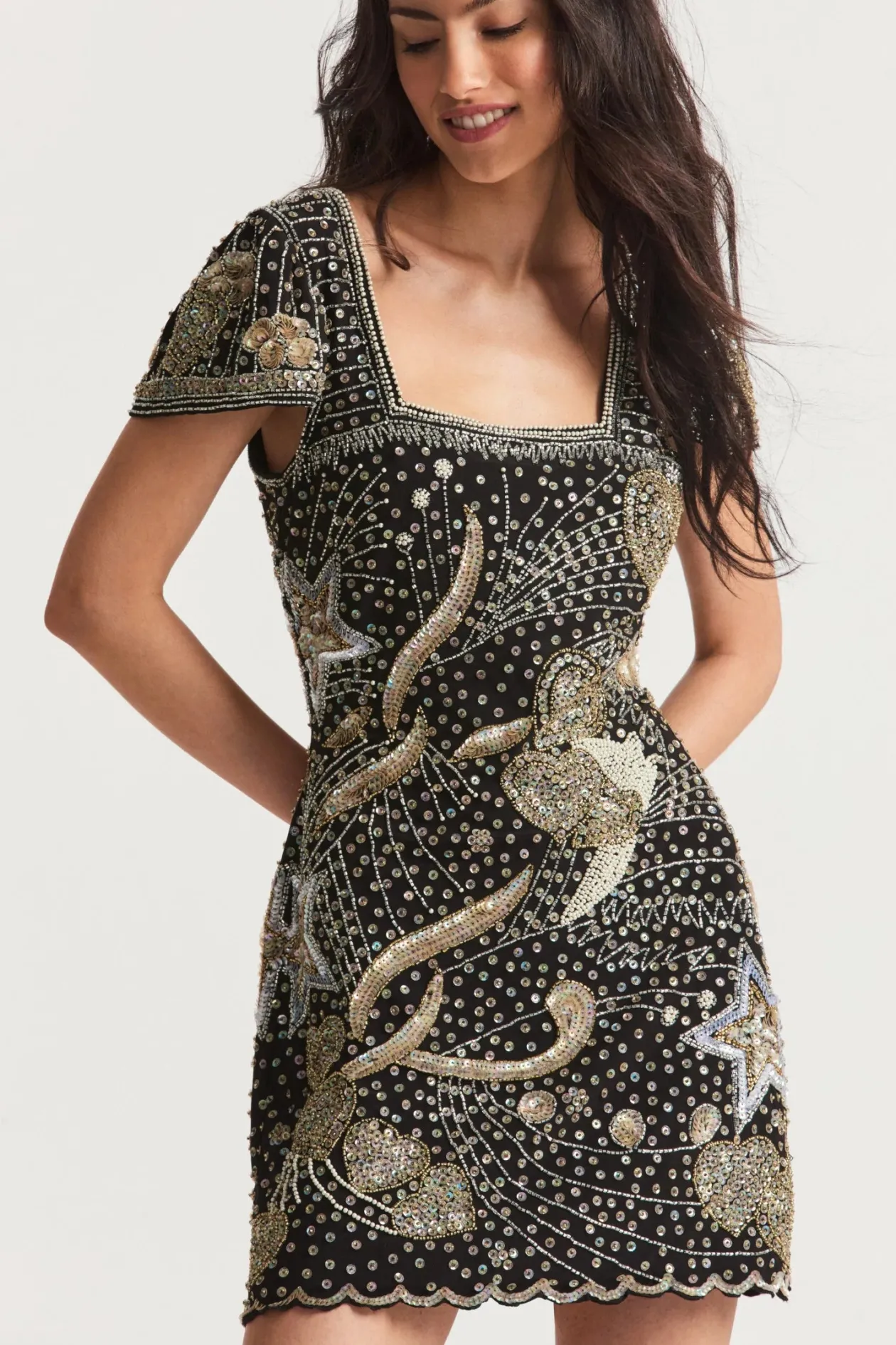 Living for the night in our new Davis Dress. This 80’s-inspired mini paints a midnight scene with over the top embellishments of iridescent gold and silver sequins and gorgeous palette of three colors outlining a beautiful arrangement of whimsical hearts and stars with wisps and sprays of shimmer all over on a stretchy crepe fabric for easy wear, but a decadent look. Fully lined, this dress features a square neckline, cute cap sleeves, a fitted style, and a small sweep with a sequined scalloped finish.