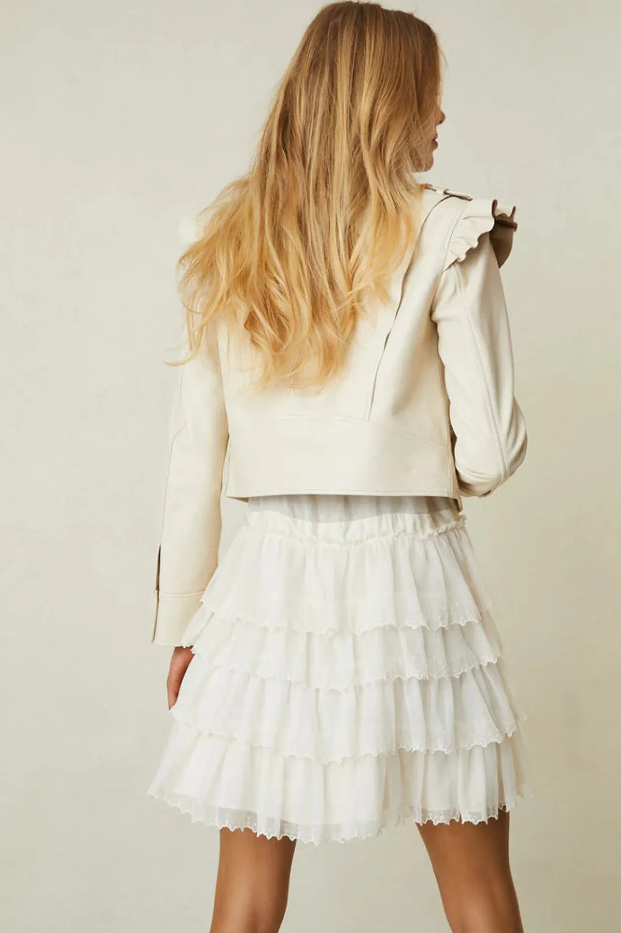 Inspired by falls in London, our Torrez Jacket makes its debut. This motorcycle jacket is designed from real leather and features crystal snap detailing and exposed zipper pockets.