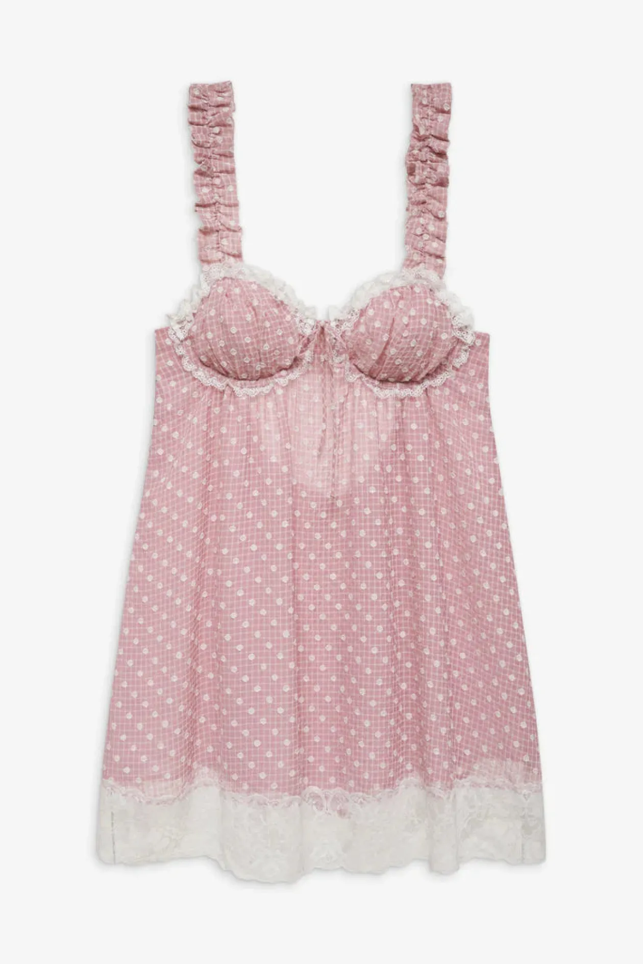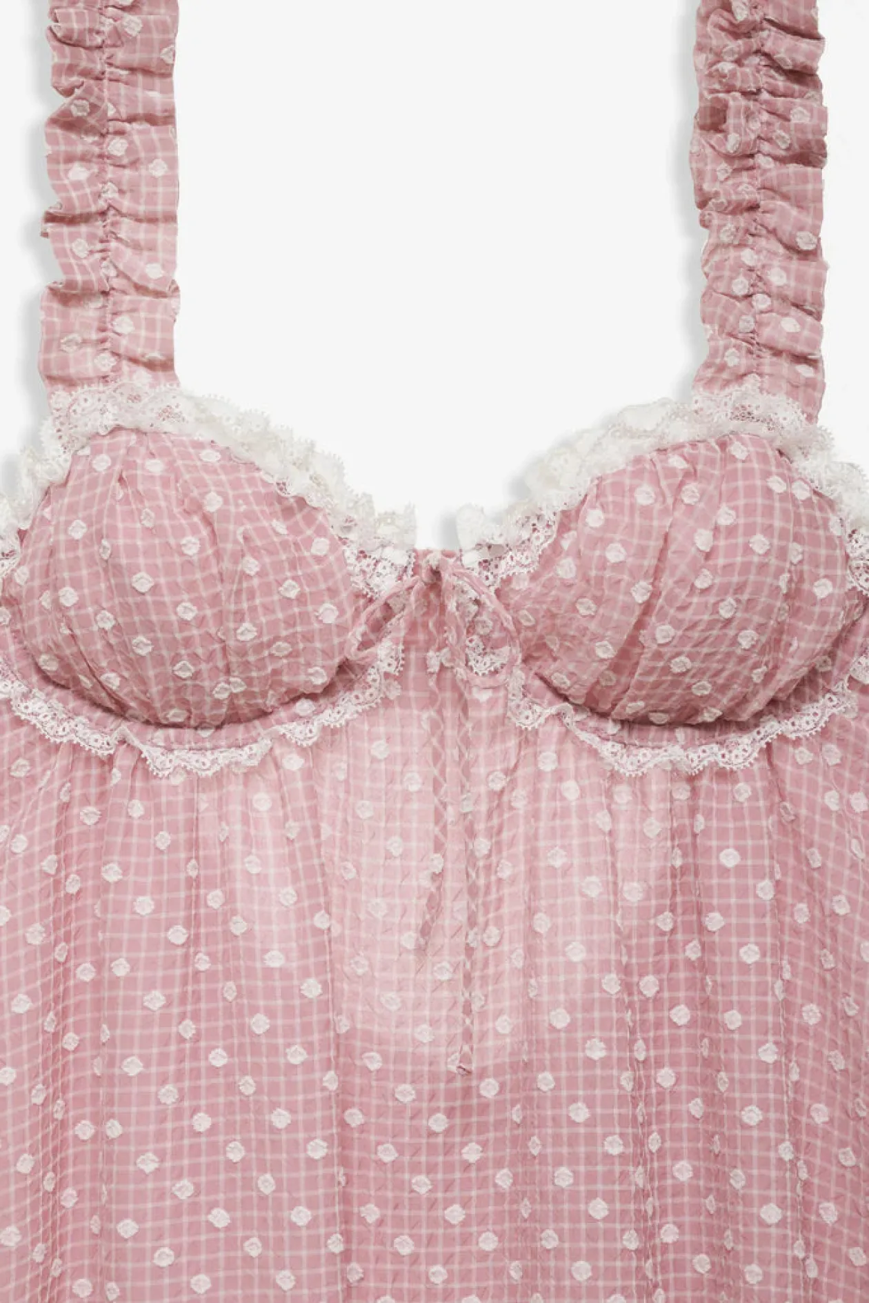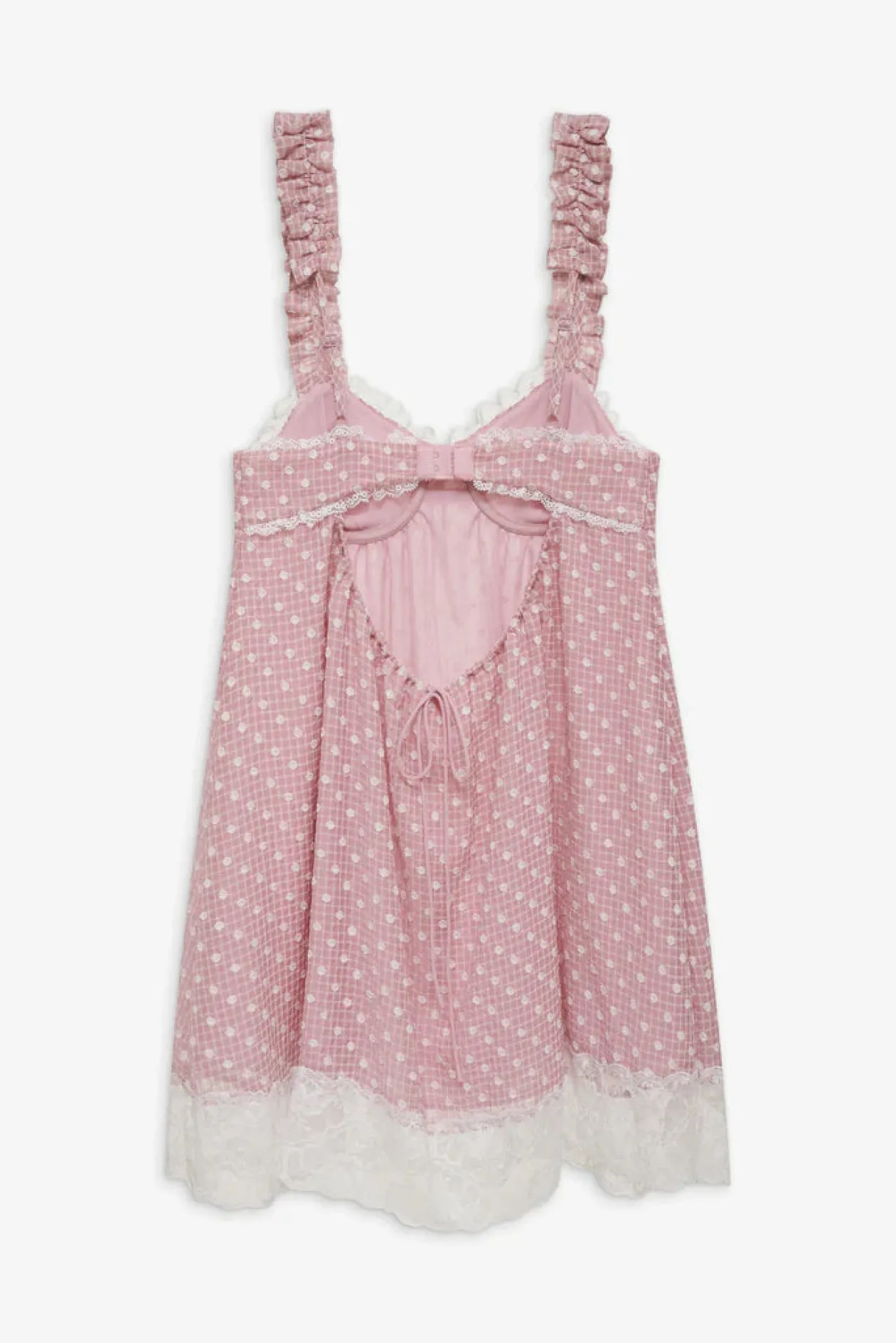 Crafted in a fuzzy gingham dot fabric—reminiscent of vintage tablecloths—the Melanie pink mini dress has laid-back summer appeal. Featuring ruched underwire cups trimmed in lace, this babydoll dress is finished with a lace bow at the center-front gore and a wide lace trim along the skirt opening.