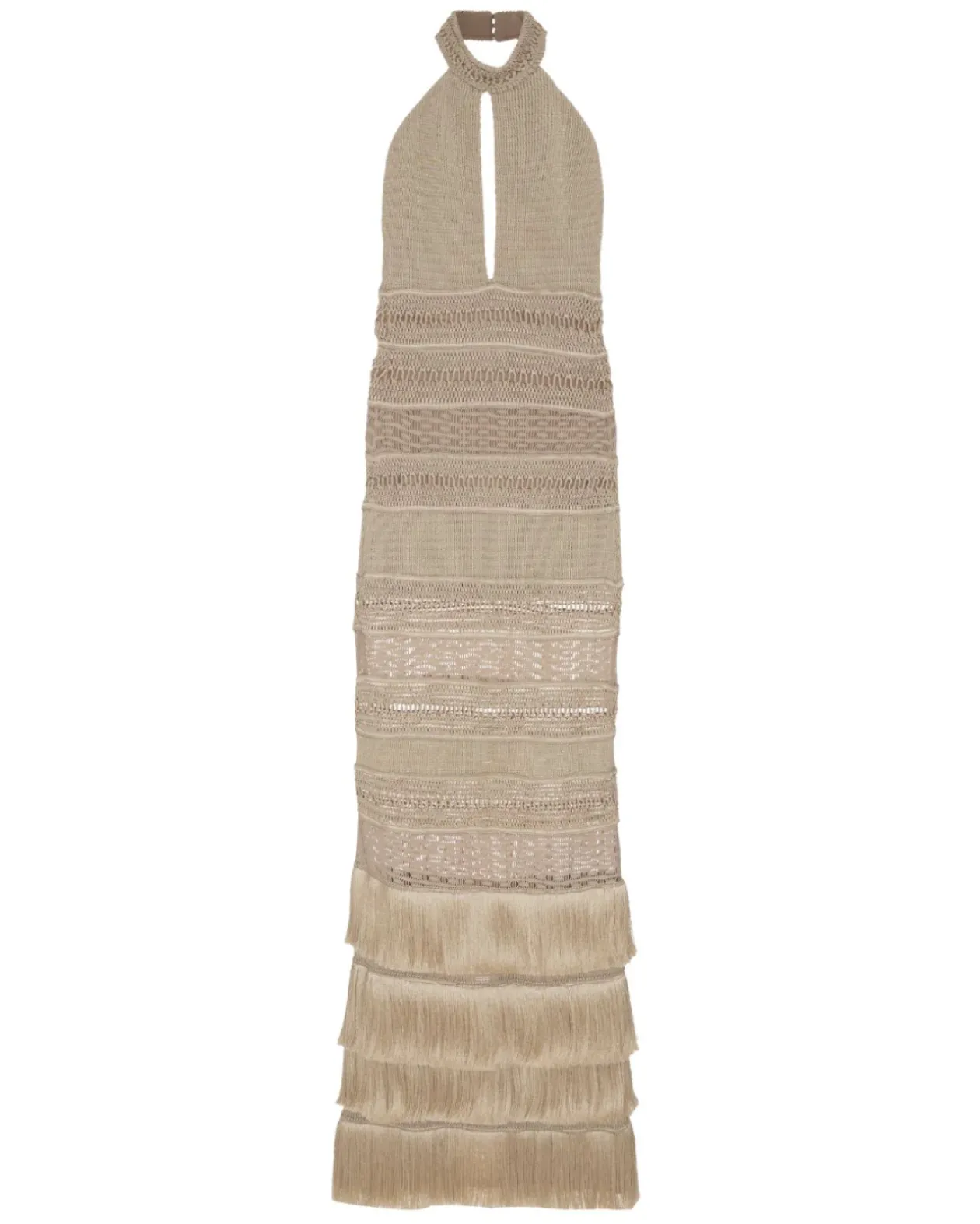 Metallic Knit Halterneck Maxi Dress features a sleeveless bodice made from lurex knit trims that are hand-sewn together. Skirt is made from layers of fringe that sway when you move. Open back halter-neck. Back zipper closure, runs large.