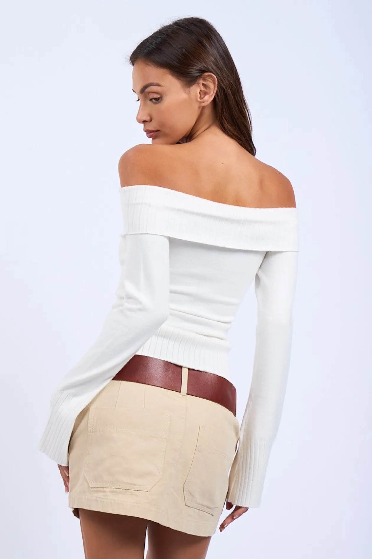 Elevate your style with our Monica Off-Shoulder Sweater in Ivory. This trendy top features a unique crossed, foldover design and an off-shoulder neckline.