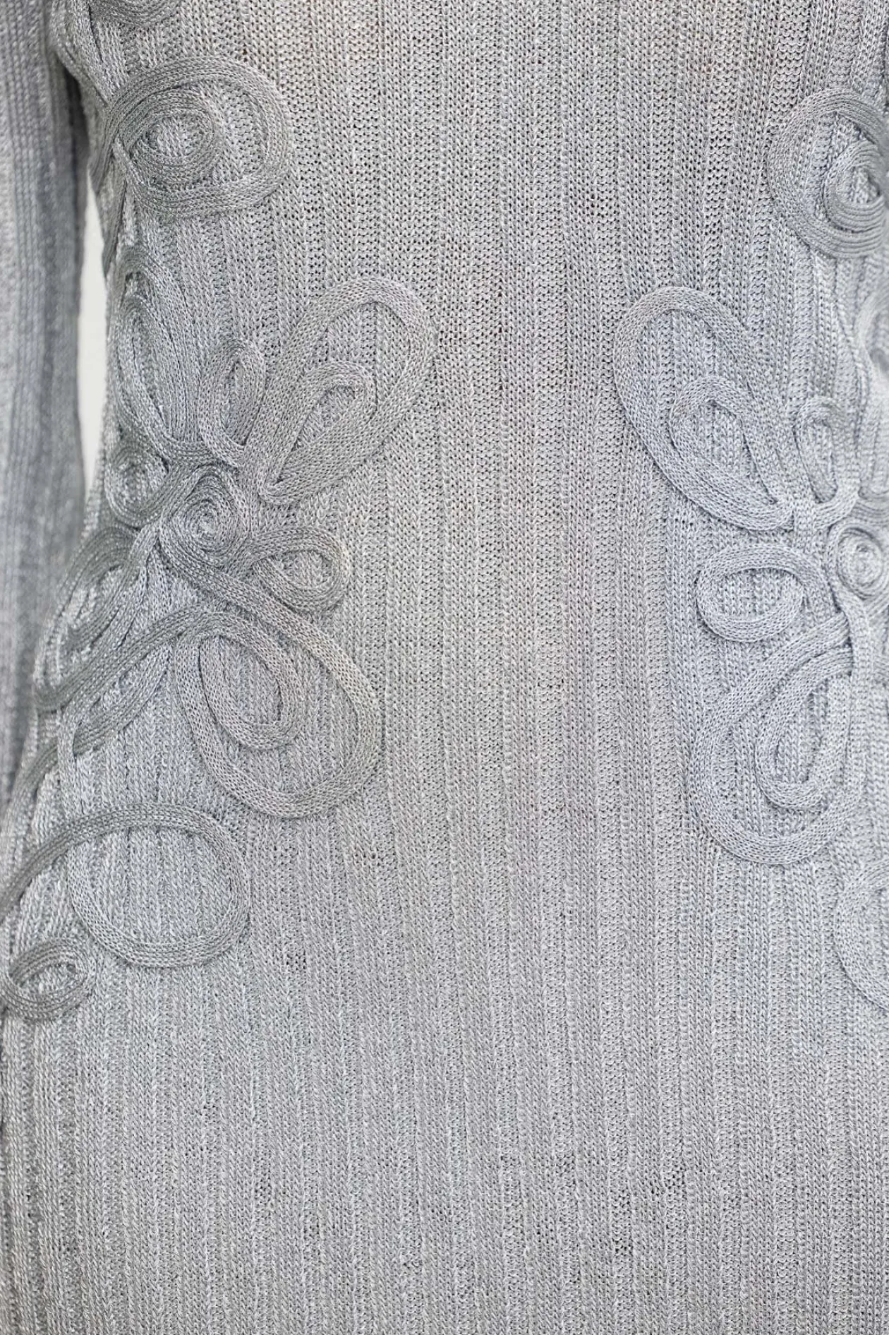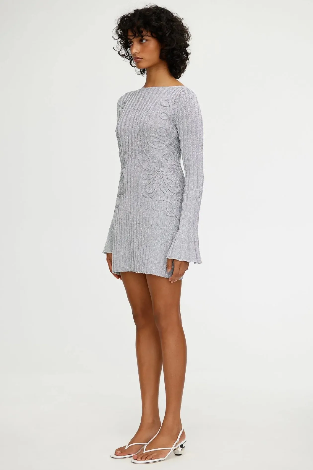The Niamh Mini Dress in Silver is the perfect statement piece that will take you from day to night. Its curling embellishment details offer a unique look that’ll make a lasting impression. Crafted from a metallic rib knit fabrication, this dress features a low scoop back neckline and long bell sleeves.
