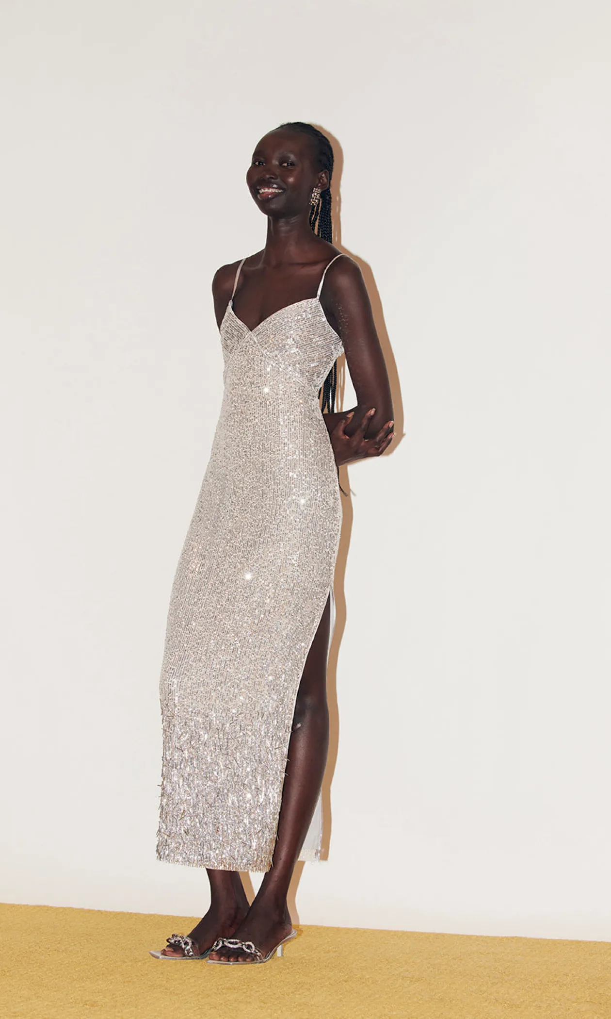 Just bead it, our beaded sequin Ophelia dress is the star of the season. The sparkly midi is cut from a beaded sequin fabric that glistens all over. The silver piece has a flattering fit- a sweetheart neckline, slim fit, and side slit. Style Ophelia with silver heels for a monochrome metallic look.