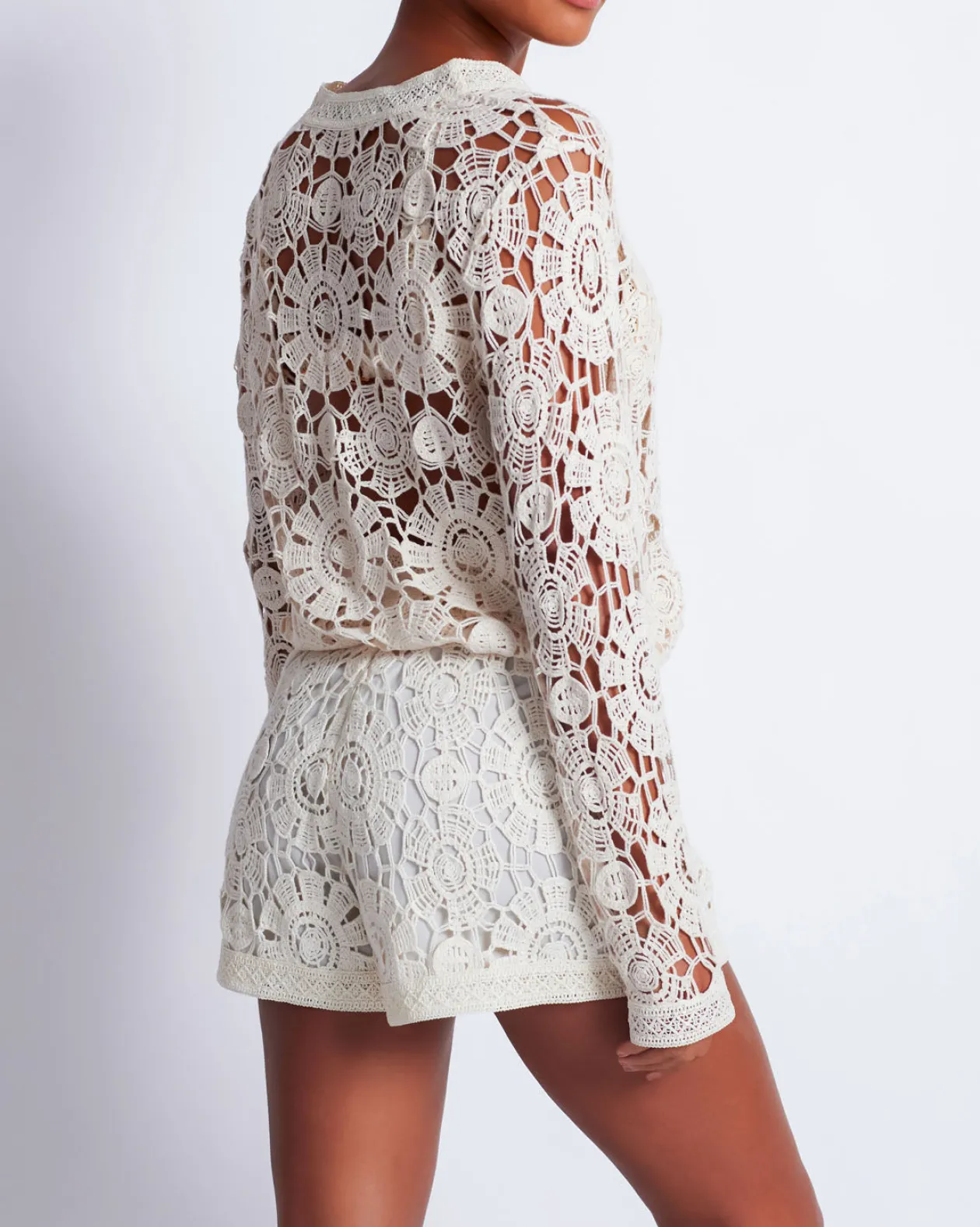 Crochet cardigan with wide sleeves and a button-front closure. Designed to be slightly boxy for an oversized fit. Gold-tone button closure. Two front functional pockets. Unlined. Runs true to size. Model wears a size Small.