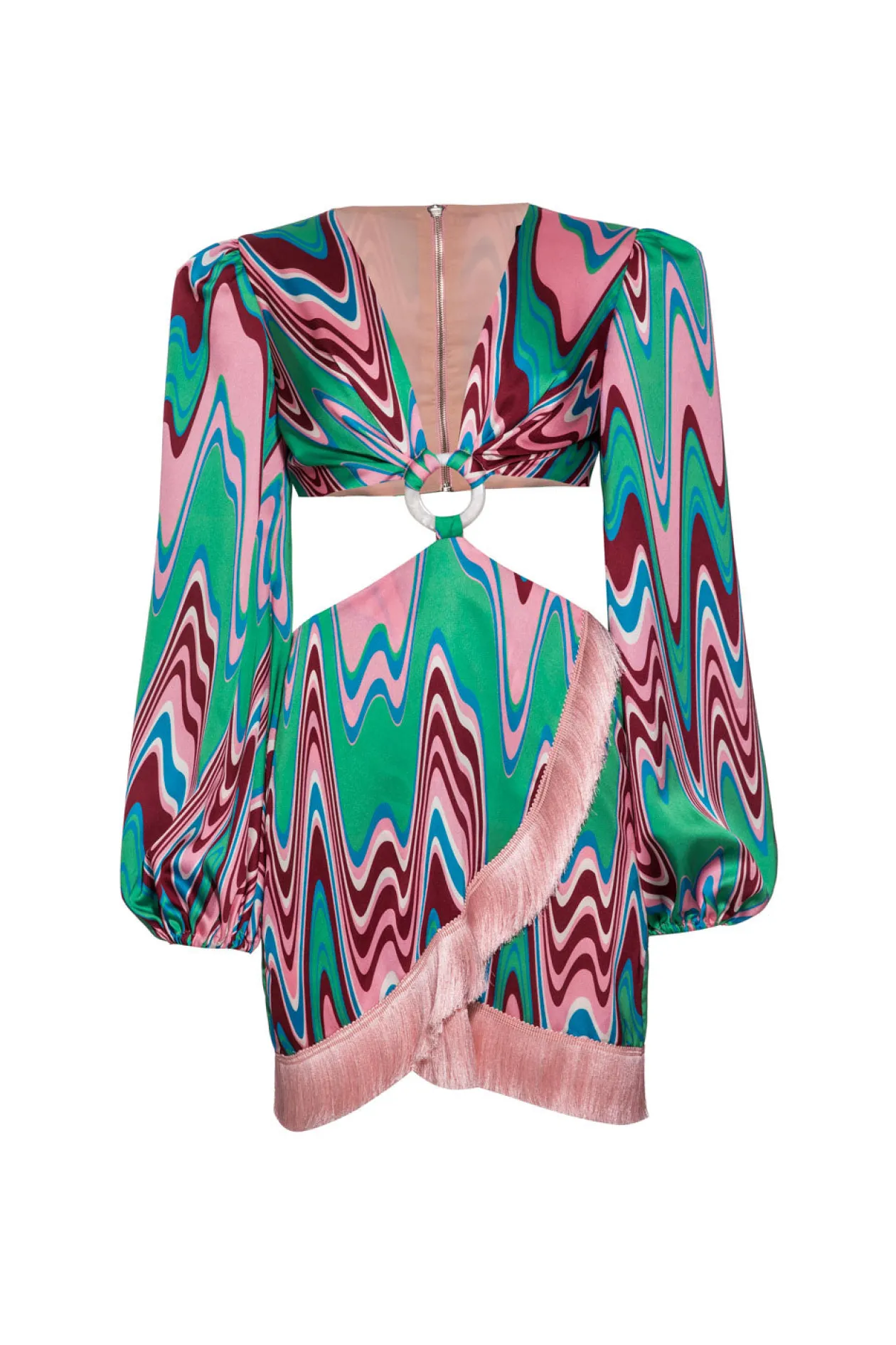 This statement dress in our original Wave print features voluminous sleeves, plunging neckline and cut-outs at the center of upper ribcage. Runs true to size. Model wears size 4.