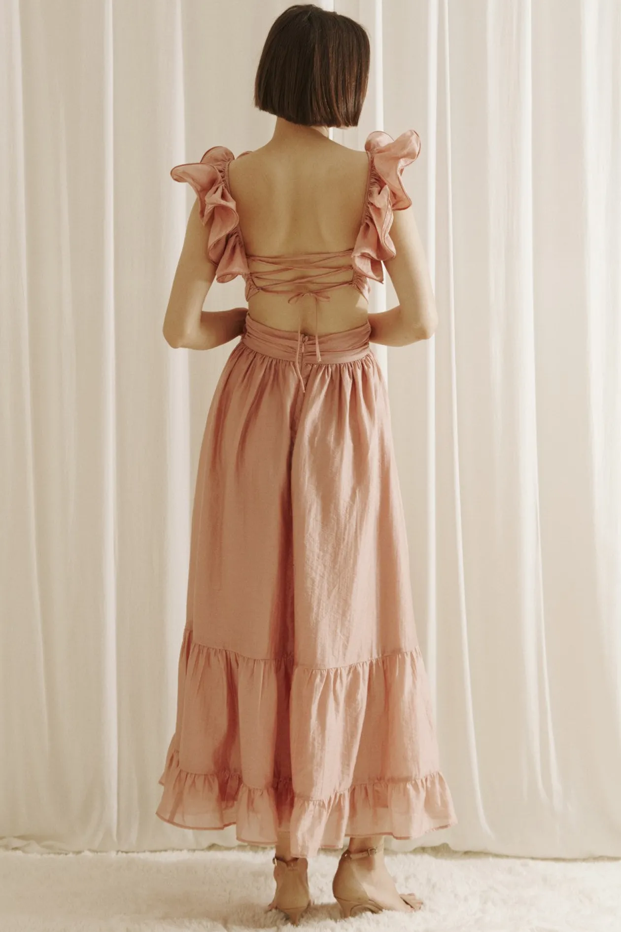 It also has a ruffled maxi bottom, an open back with a criss-cross back tie, and a lower back invisible zipper.