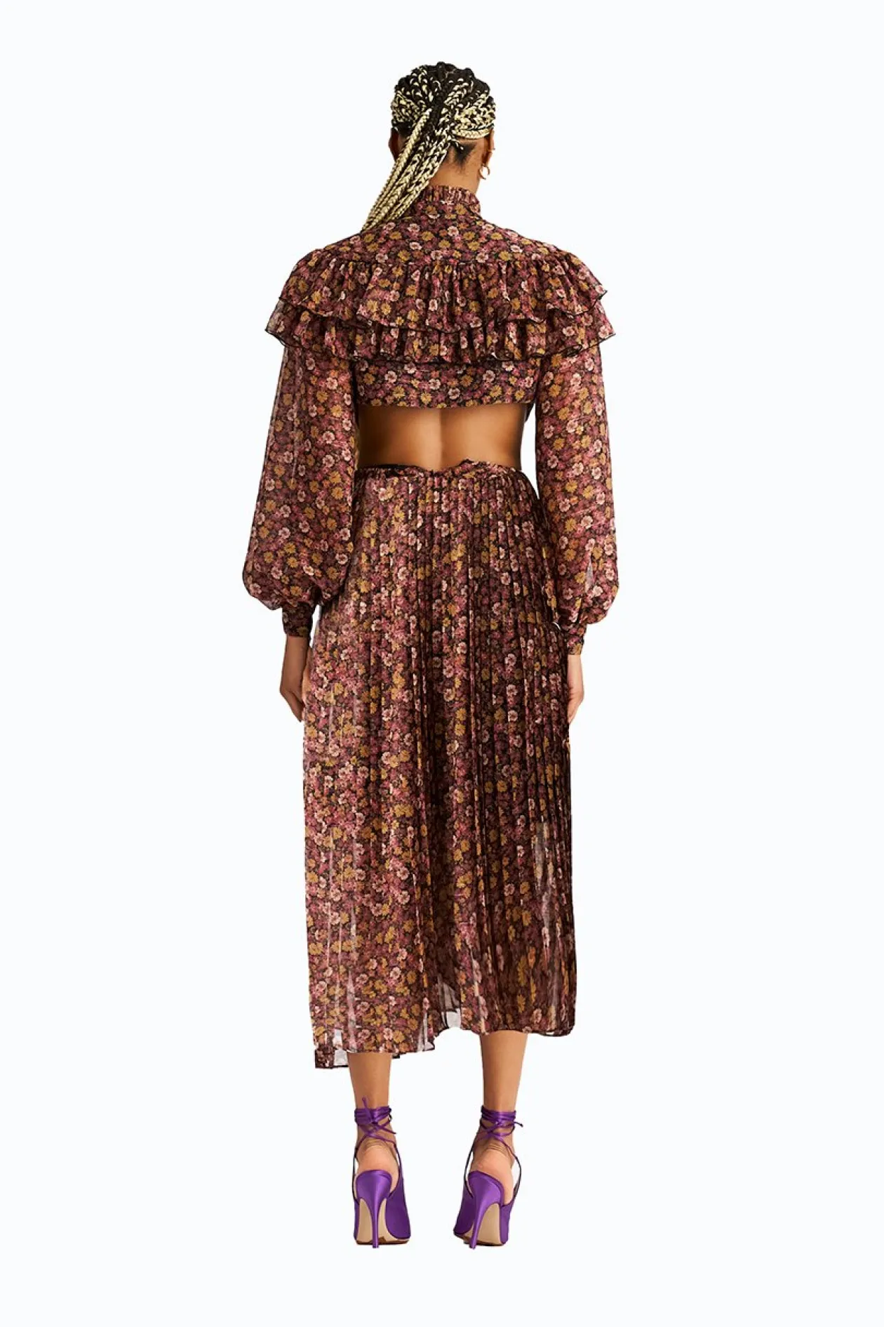 No detail is overlooked when it comes to Ronny Kobo, and this dress really showcases her eye for intricate design. Cut from airy chiffon, it’s printed with floral motifs and adorned with ruffled tiers along the upper bodice while the skirted bottom has accordion pleats. Semi-sheer long sleeves and cut outs at the waistline add to its romantic feel.