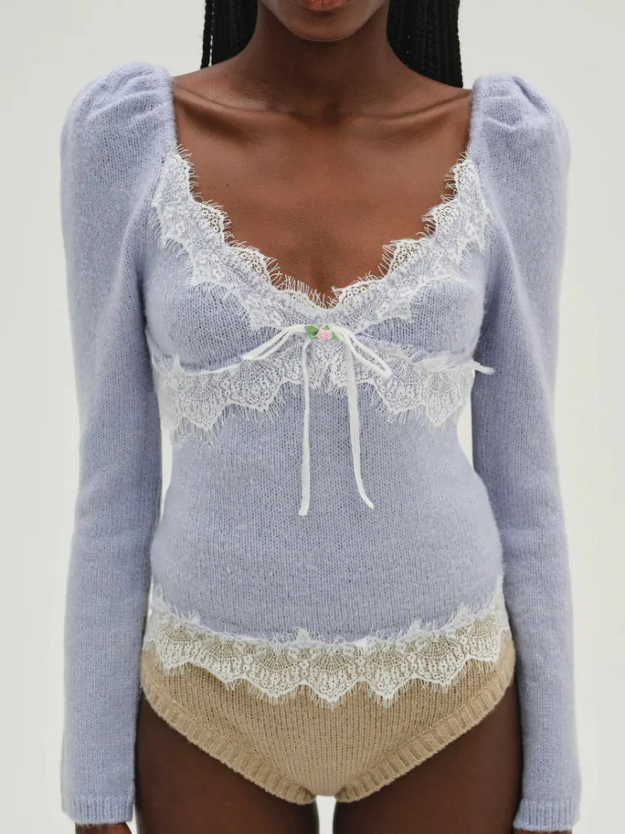 Crafted in lightweight mohair pointelle, this light blue sweater has ultra-feminine appeal. Featuring long sleeves, this knit top spotlights a pretty scalloped lace trim at the neckline, underbust, and hem. It’s adorned with a sweet bow and rosette at the neckline.