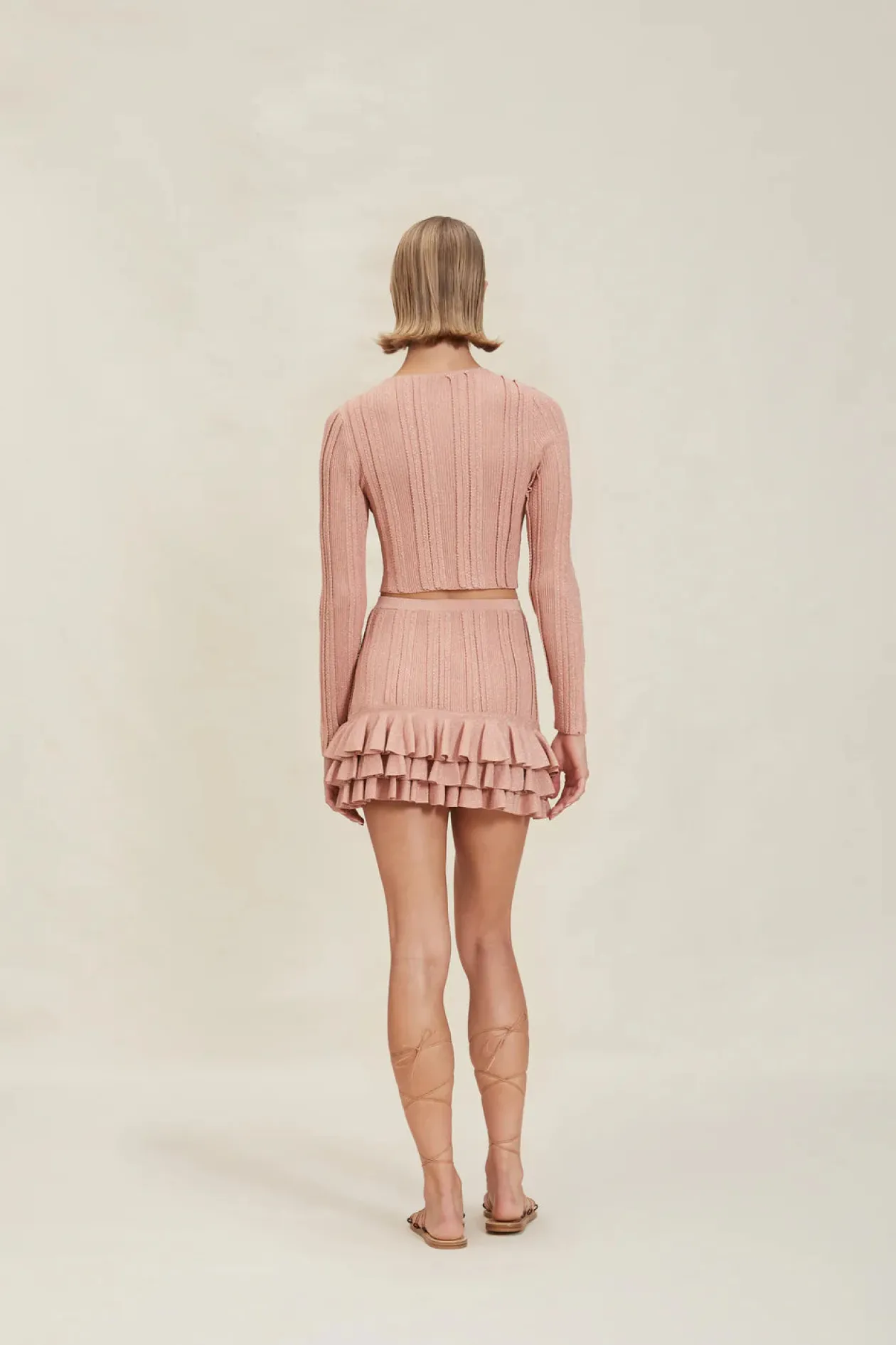 The Sam is a ruffled, mini skirt that pairs well with crop tops and the matching Sylvie Cardigan.