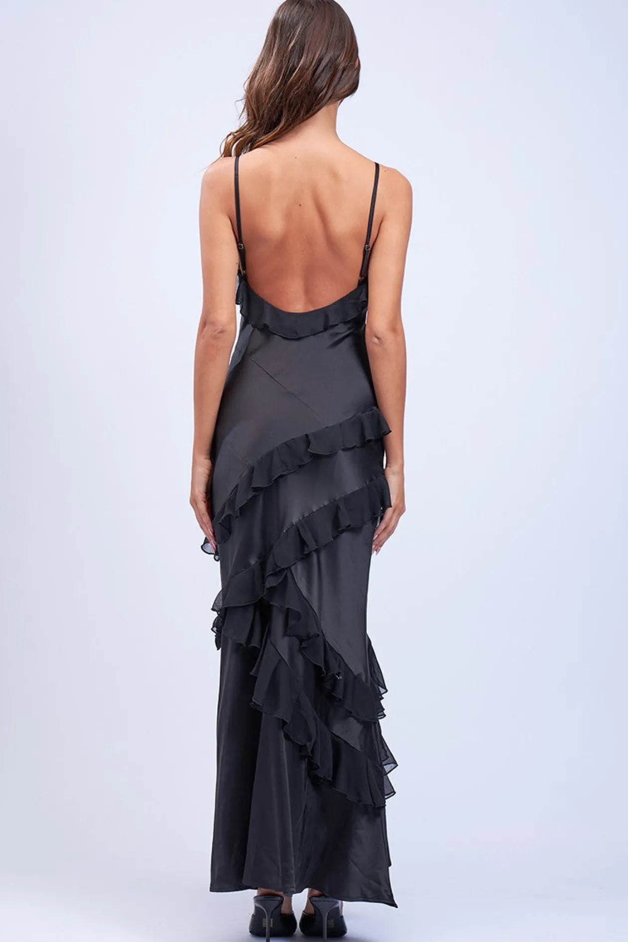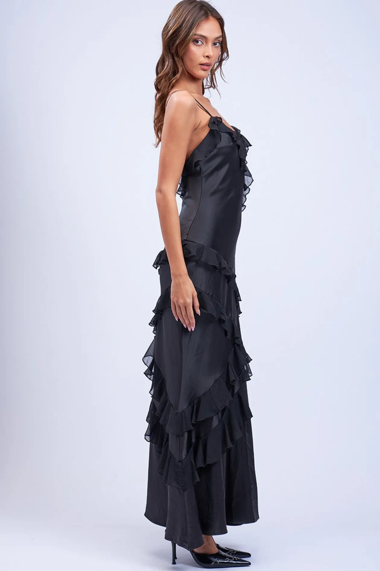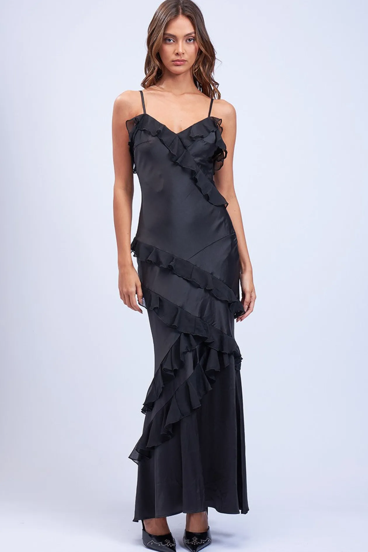 Effortlessly elegant, this Satin Ruffle Maxi Dress features a stunning satin material and sleeveless design. The ruffle trim adds a touch of femininity, while the maxi length offers a sophisticated silhouette perfect for any formal event.