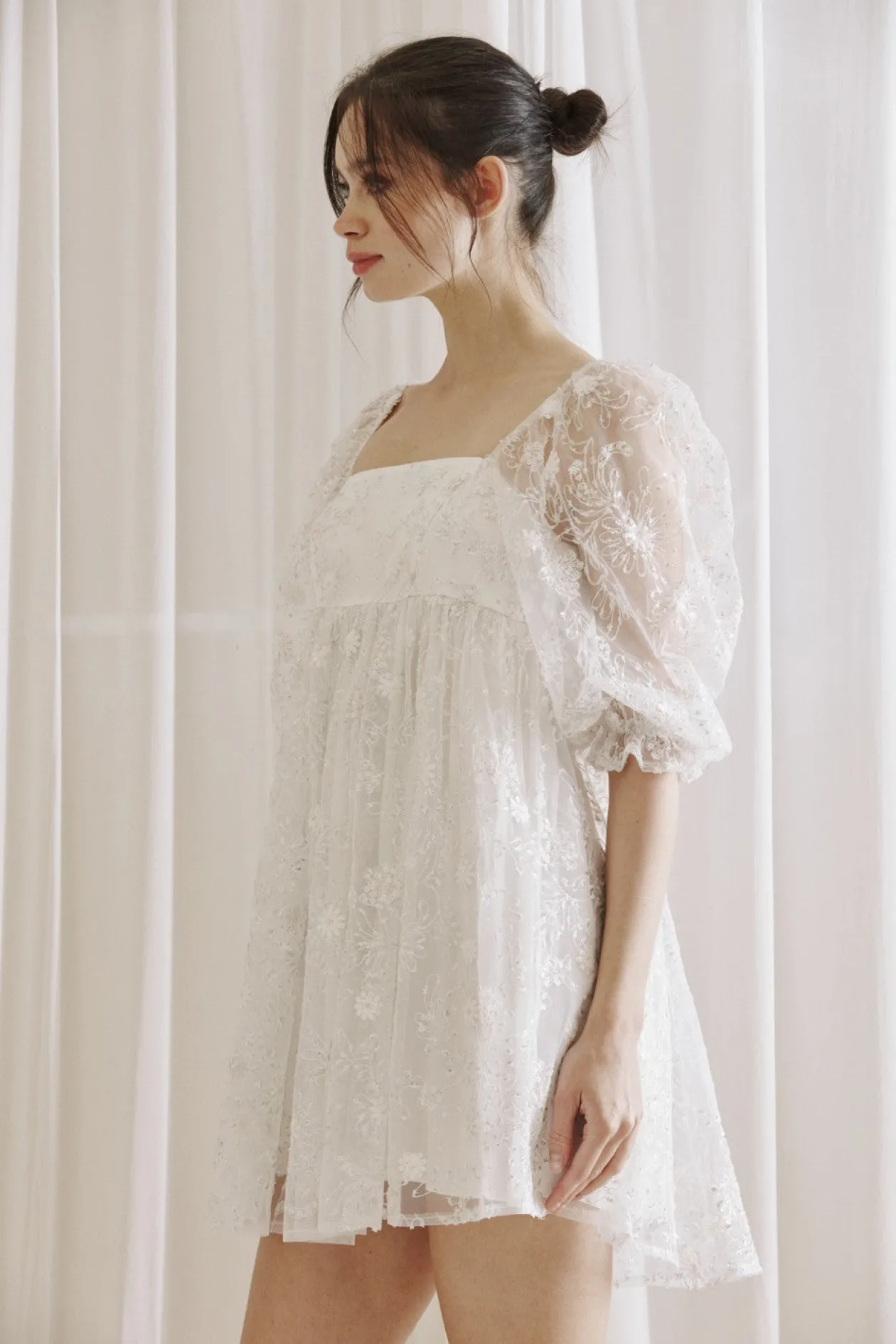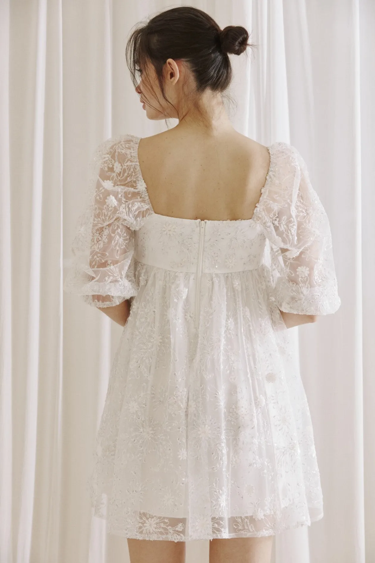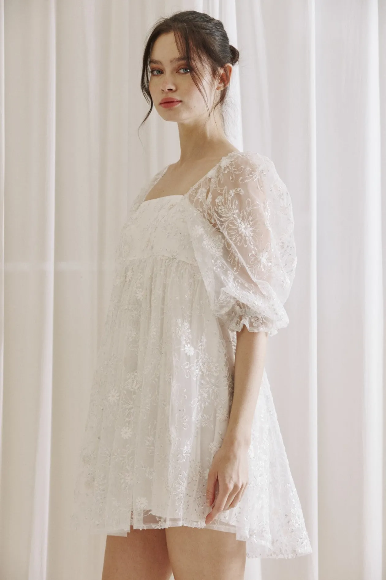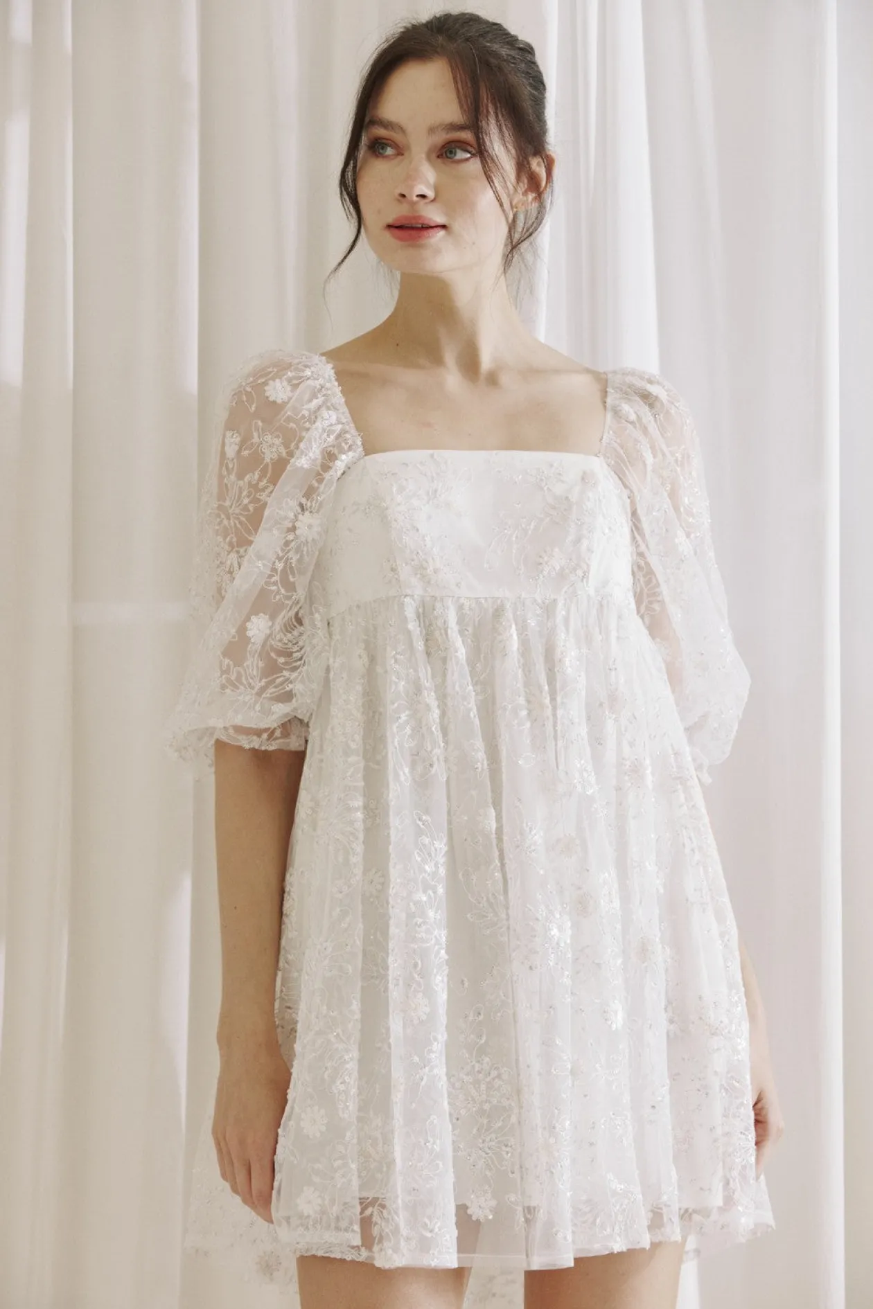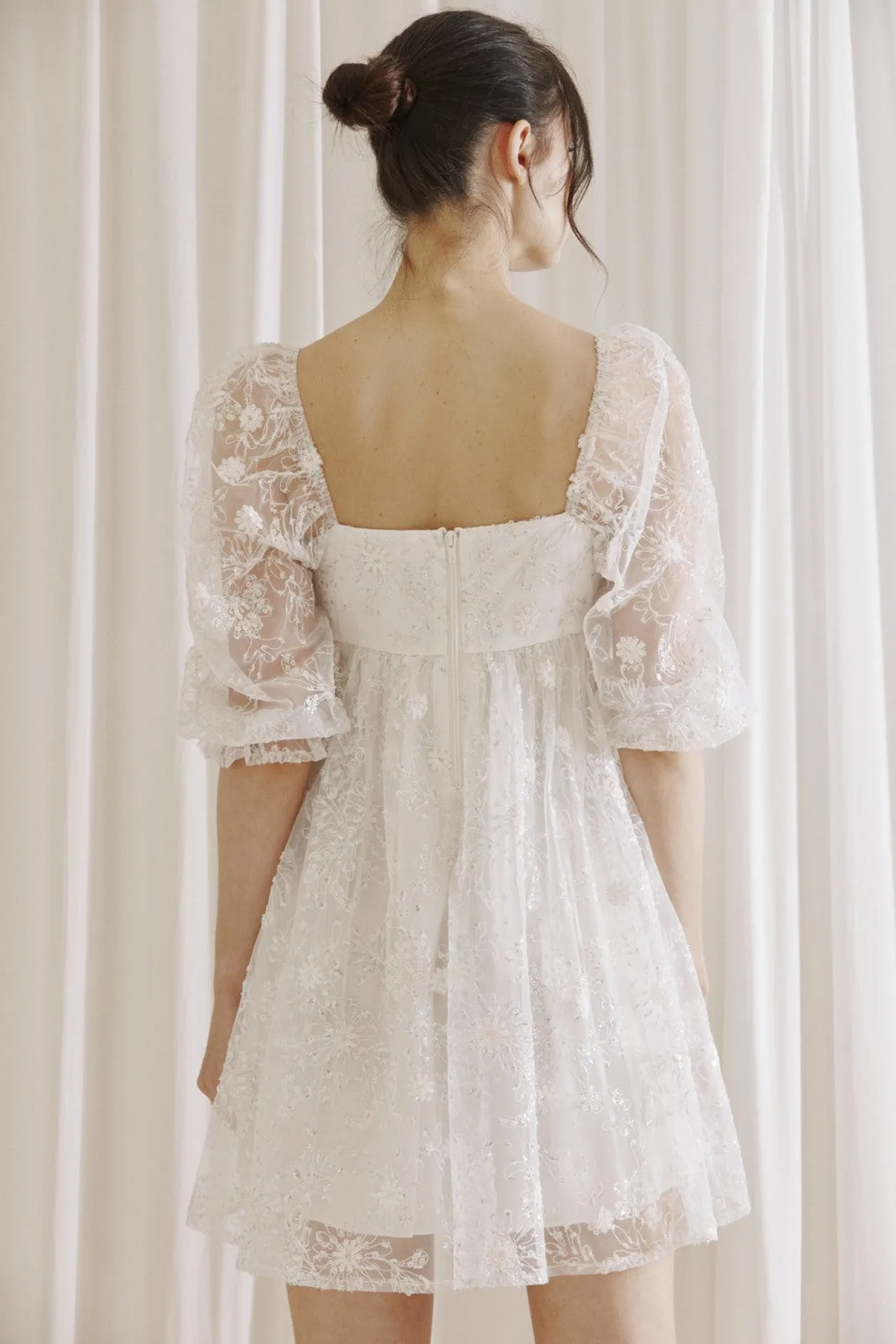 - This mini dress features a 3D daisy tulle overlay, cap sleeves, and a fit-and-flare silhouette