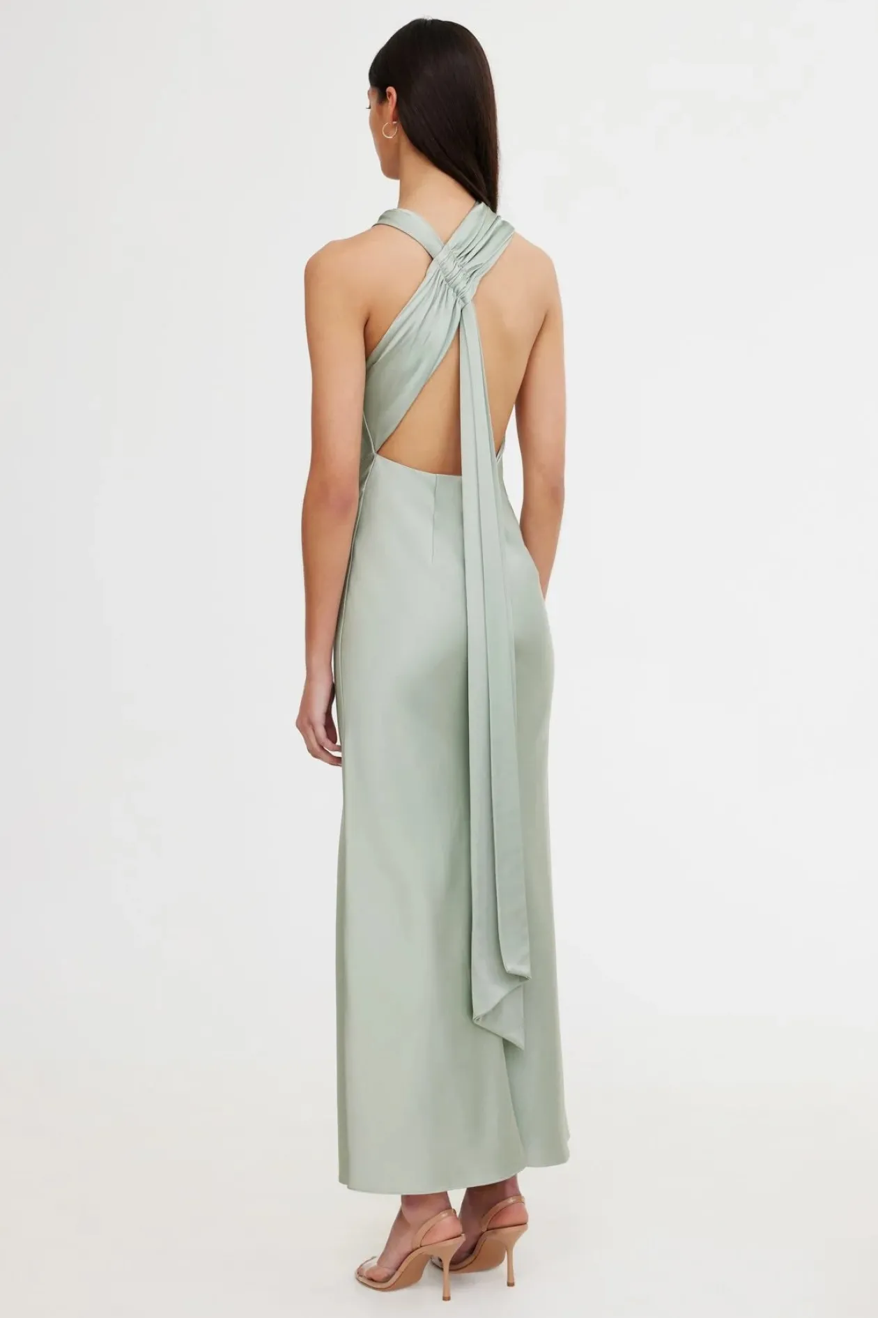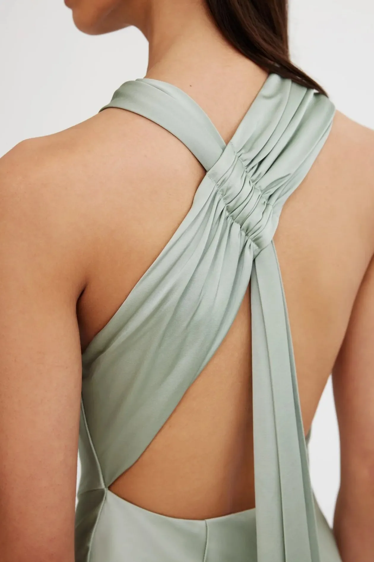 The Annabel Dress in Sage is crafted from our soft touch satin fabrication. Featuring a high neckline, soft gathers through the bodice and open back feature with adjustable sash detail.