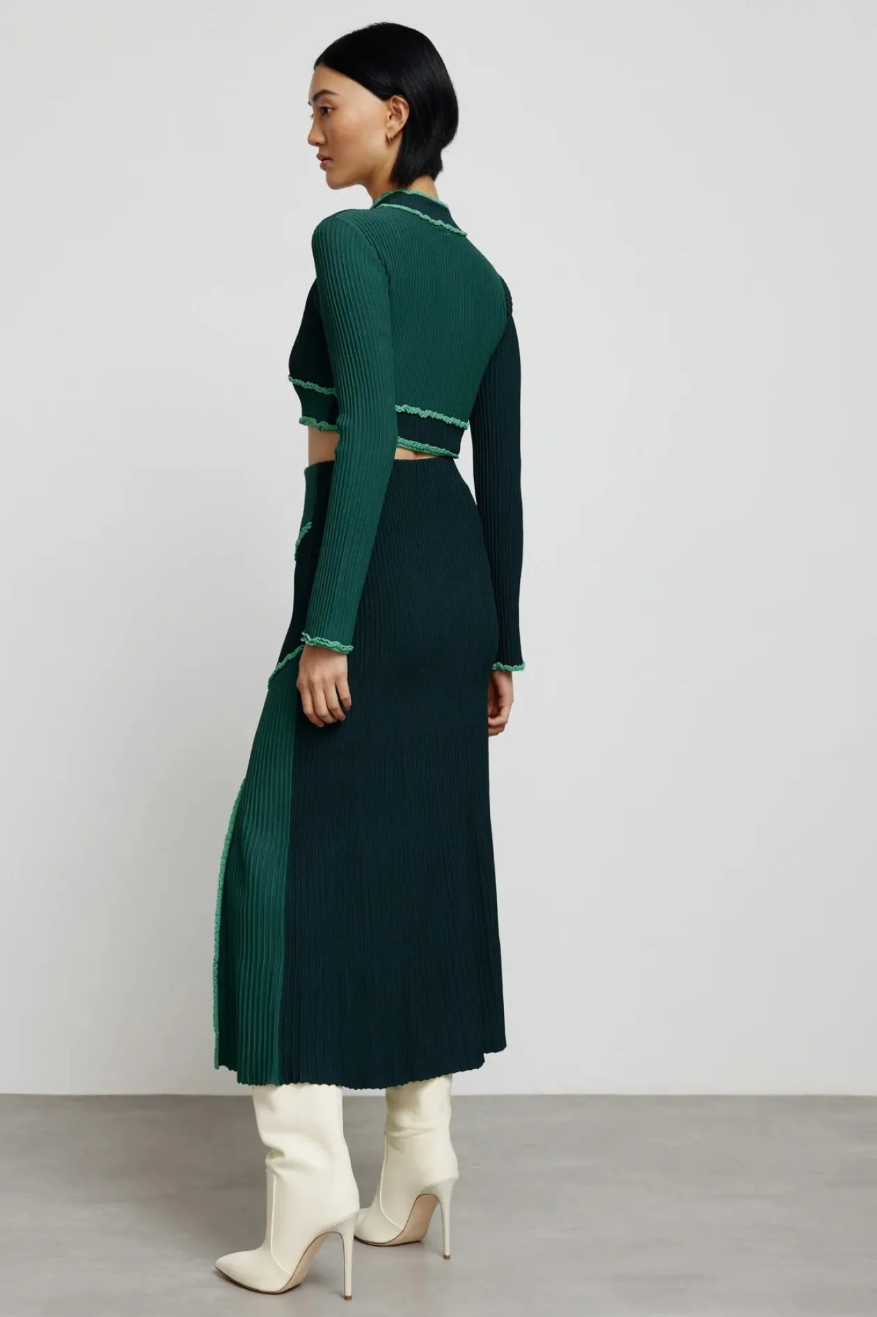 Structure and style have been skilfully combined to craft the Ginny Skirt in Teal Mix. Designed to be fitted at the waist and relaxed toward the hem, featuring two tone knit panels, side split for fluid movement and polished off with a ruffle yarn trim.