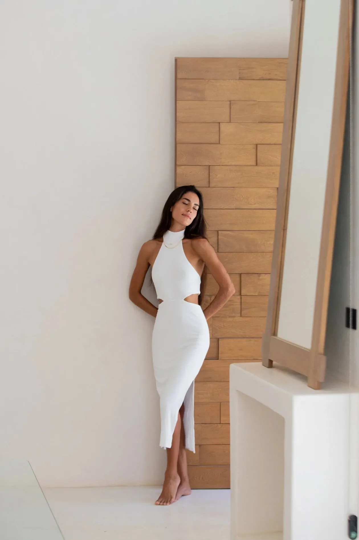 OUR HALTER NECK TIES AT THE NAPE OF NECK WITH CUT OUTS ON YOUR RIBS, WITH A HIGH SLIT. OUR 4X2 MODAL RIB IS EASY TO STYLE UP OR DOWN. KEEP IT CASUAL OR WEAR IT OUT FOR DATE NIGHT.