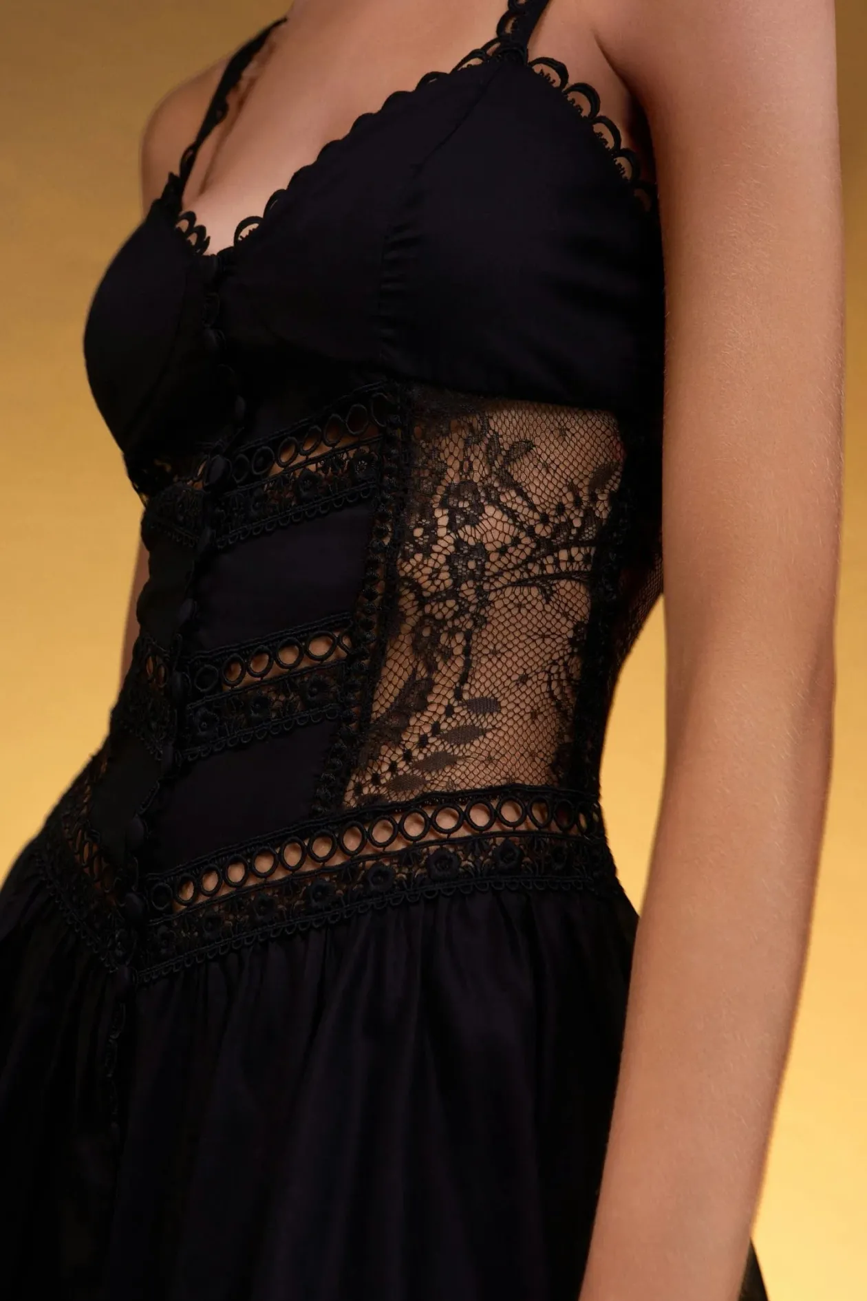 The flattering skater silhouette is reinvented with our Terely mini dress. Delicate lace sides create a rich texture along with the voile and guipure that combine throughout the length of the piece. Its button placket joins a feminine bust with a pretty mini skirt.