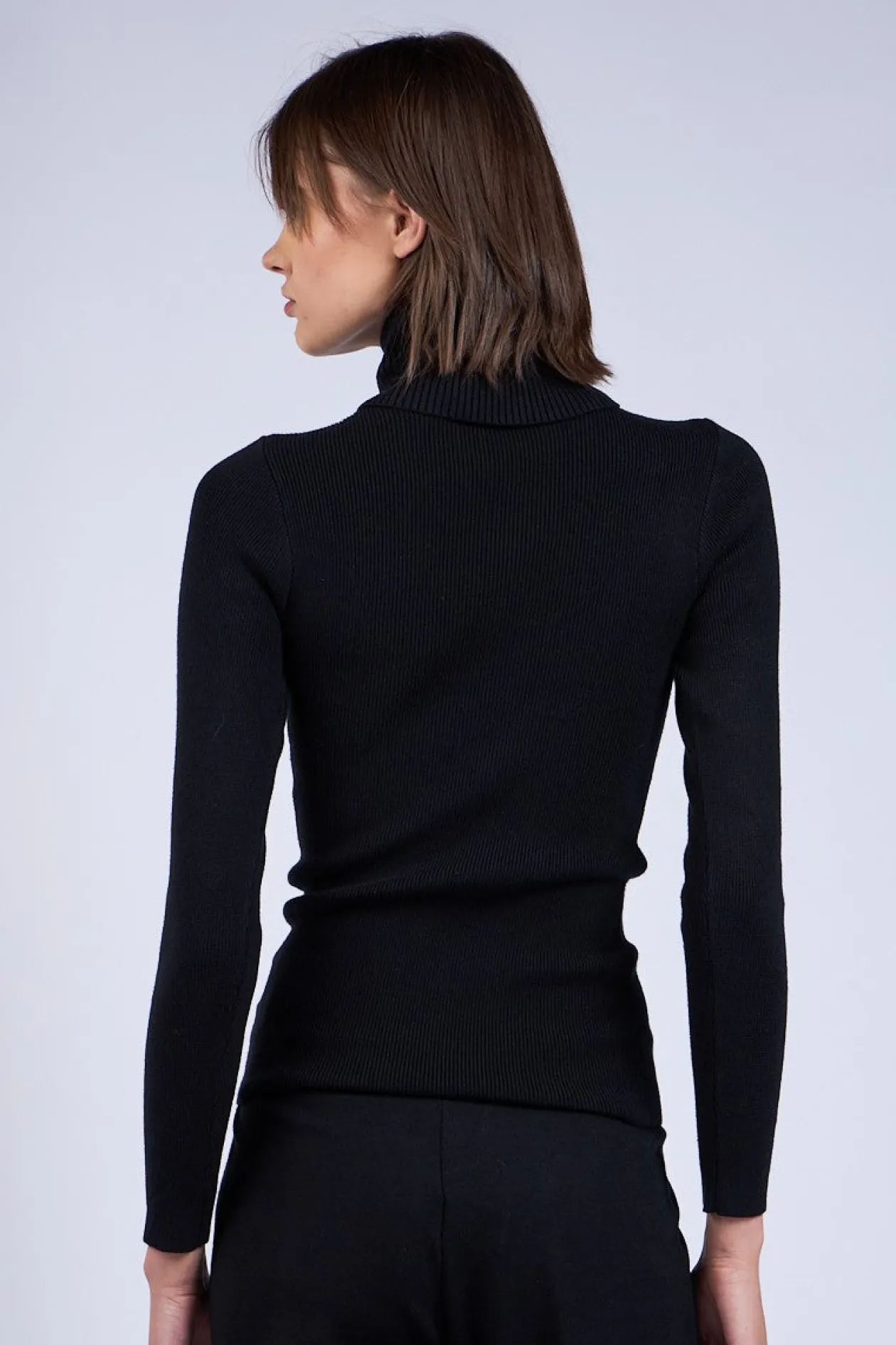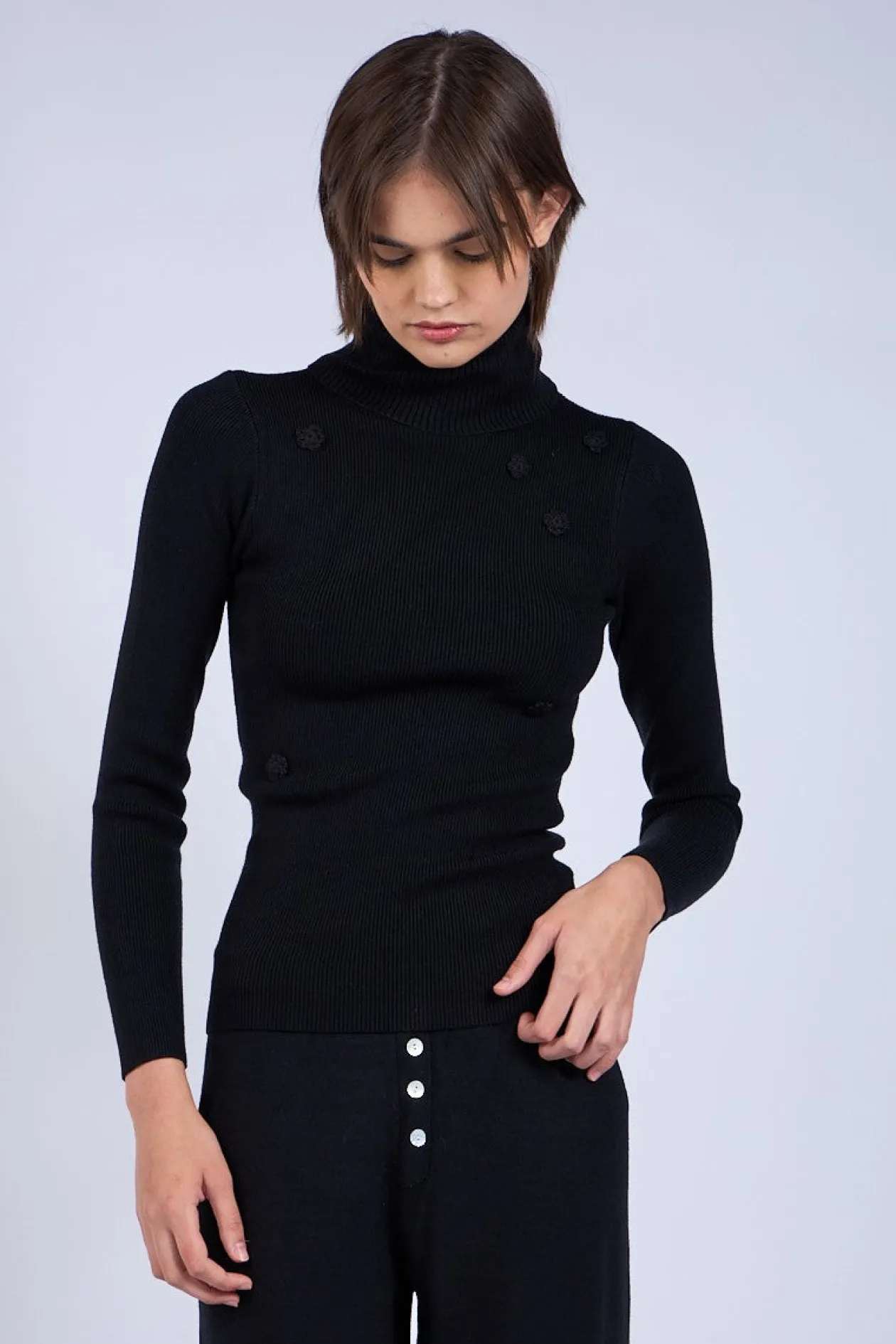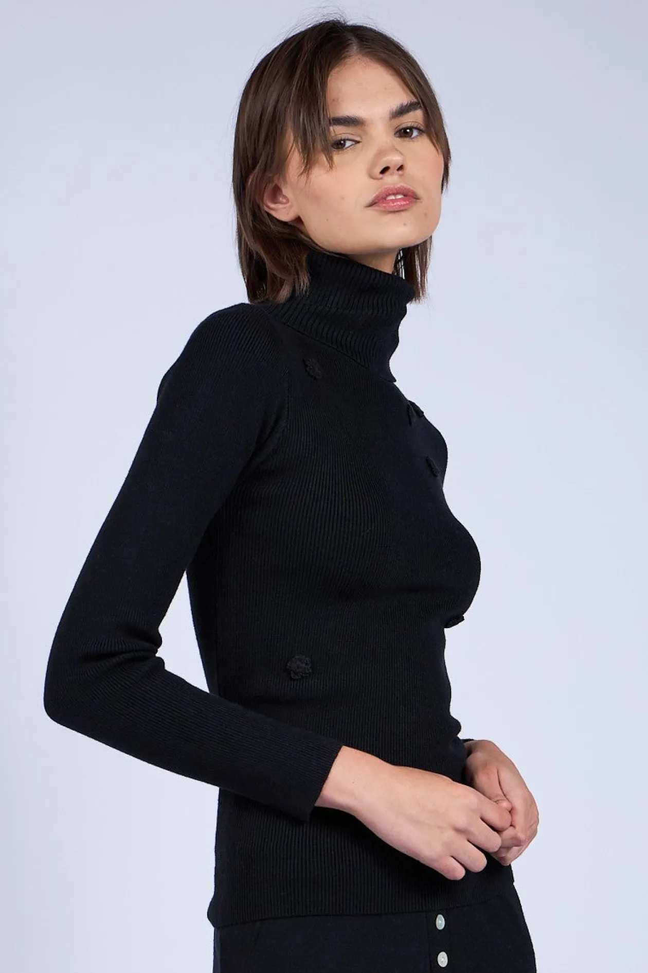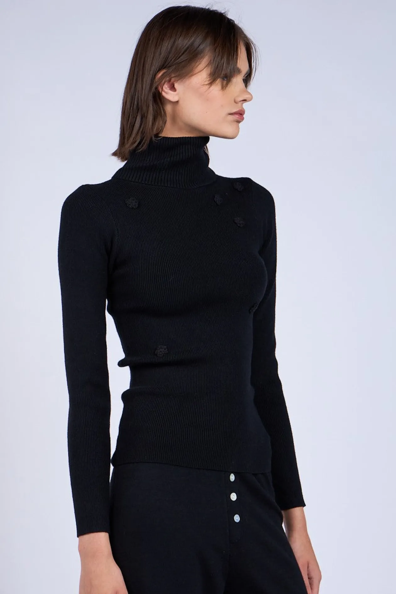 Slim fit turtleneck in black with small embroidered flowers.