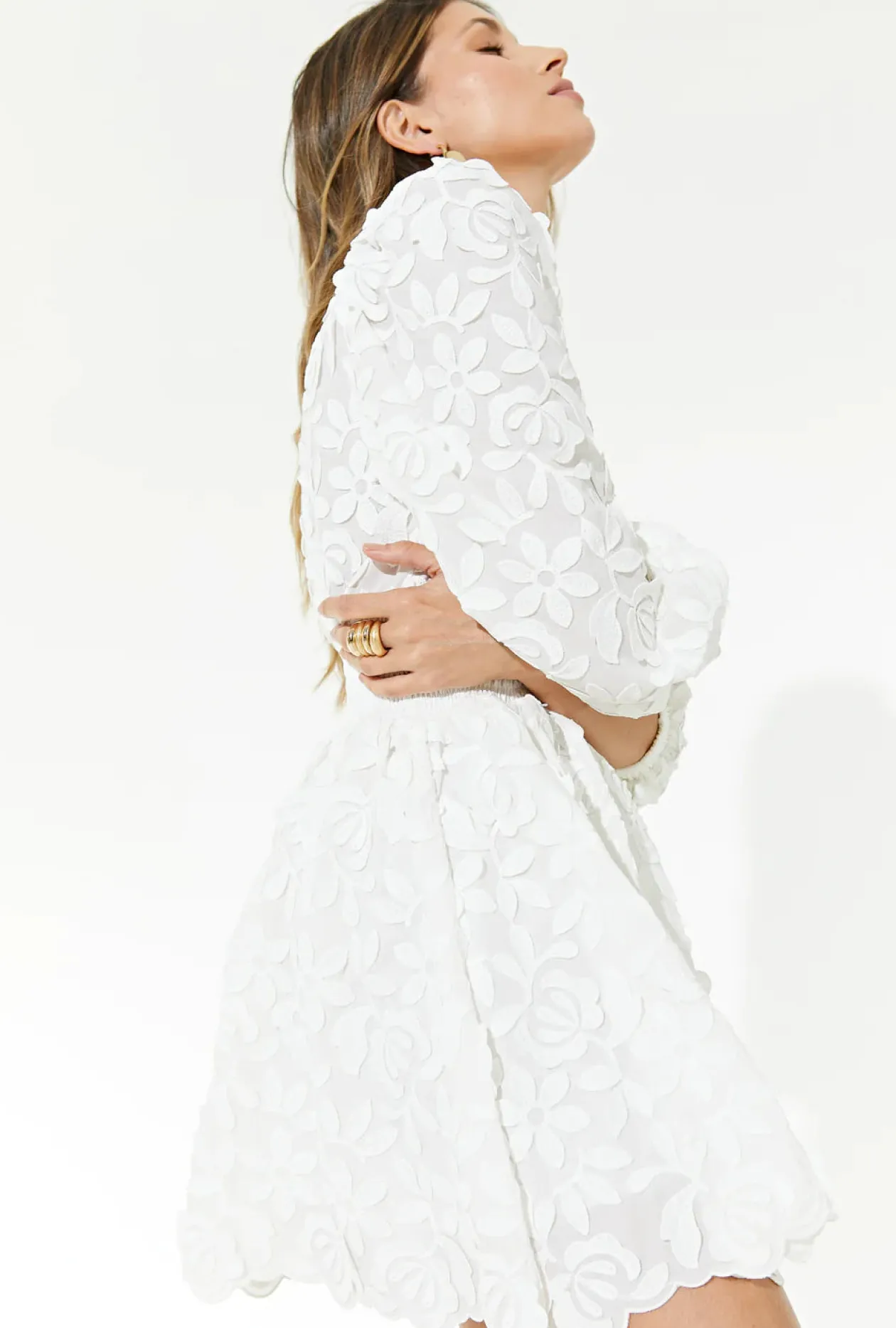 Sculpted and textured V neckline mini dress, featuring 3D embroidered flowers and long billowy sleeves. A perfect example of understated luxury, the Villa Alta dress is ideal for day events or casual chic evenings.