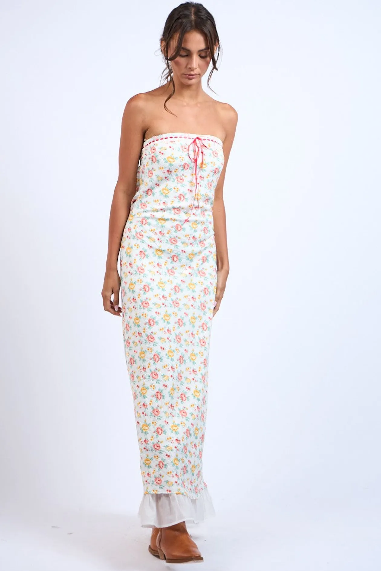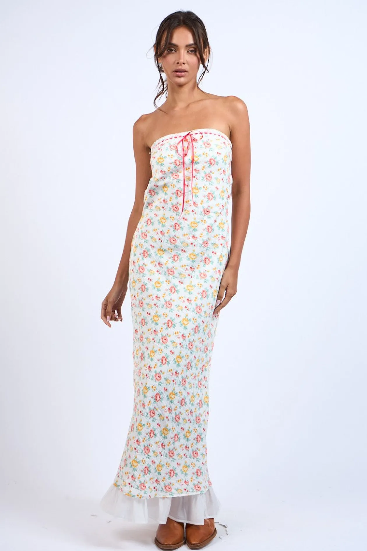 Our best selling Walk Me Home maxi dress features a strapless bodice with a *cutesy* ribbon and lace trim. An open, cowl back gives this style a subtly sexy touch. Finishing off with a ruffle at the hem, this dress ends oh so sweetly.